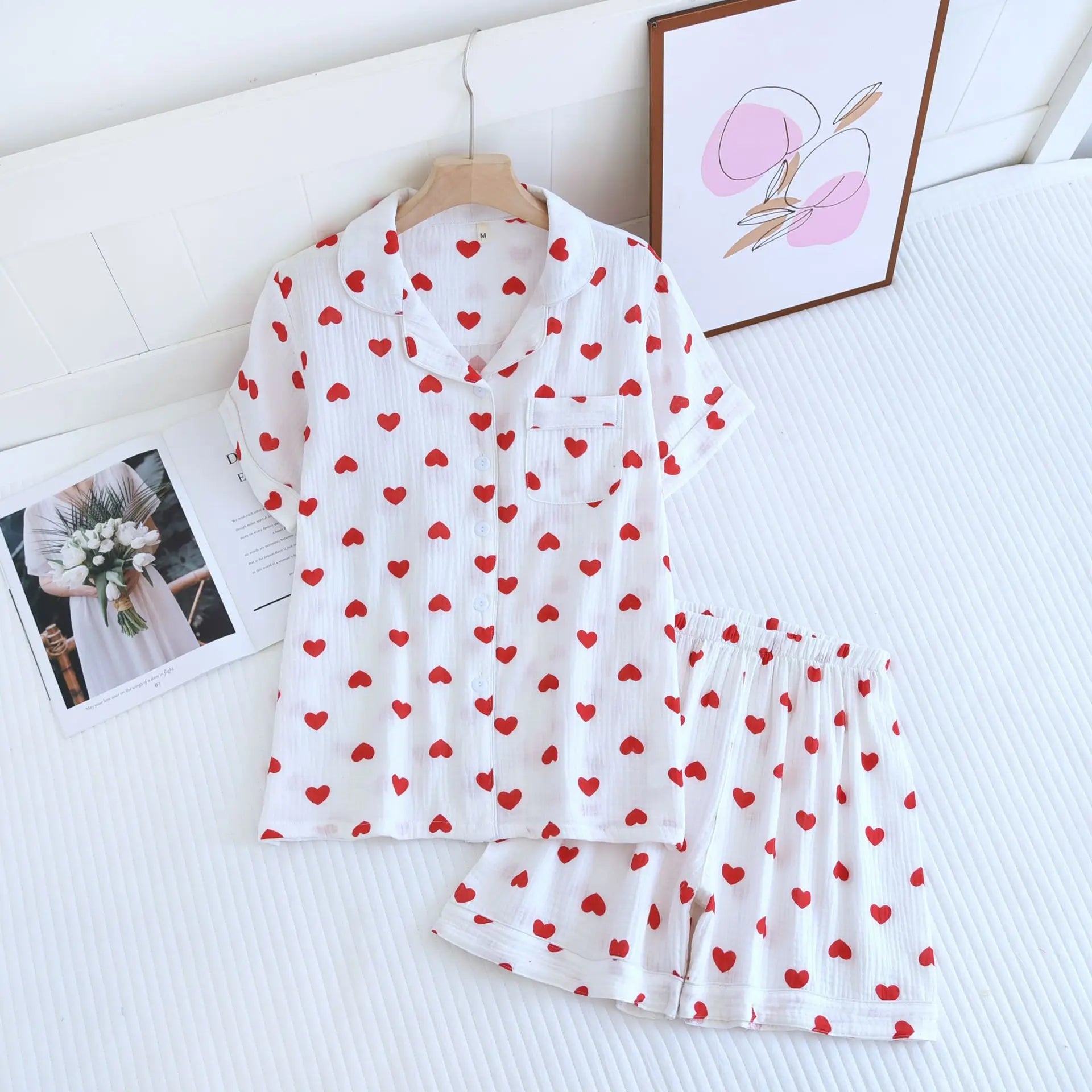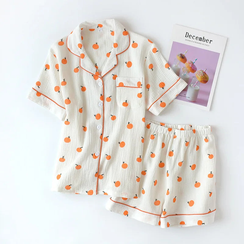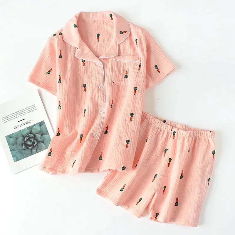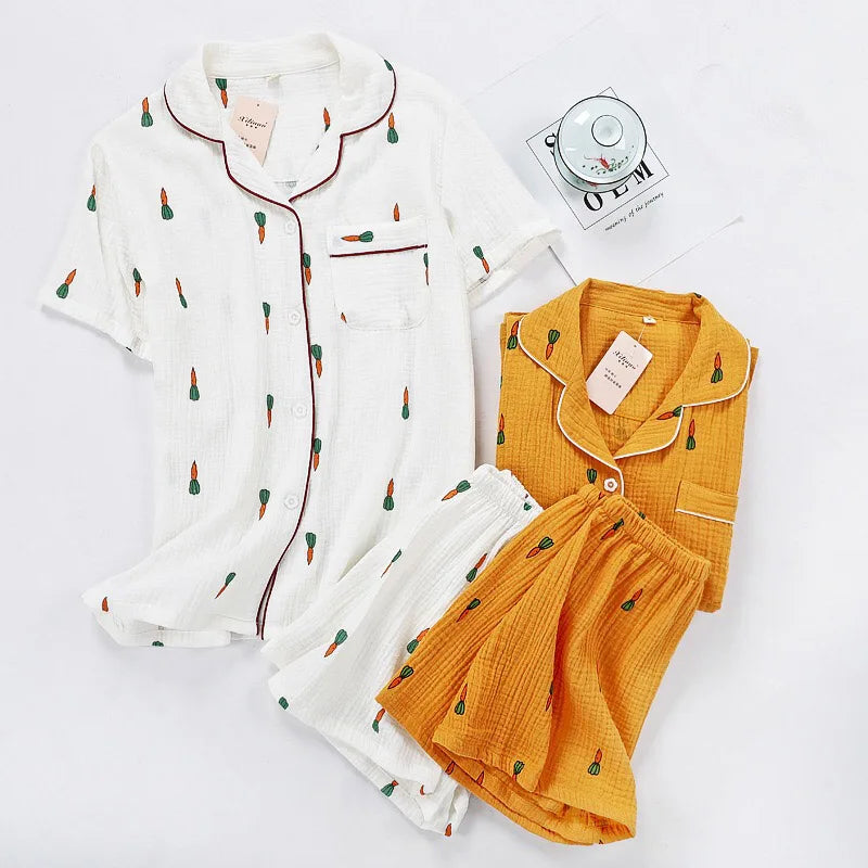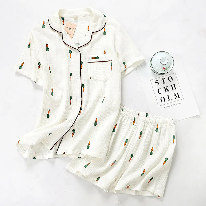 여성 잠옷 세트 여름 편안한 거즈 코튼 턴다운 칼라 잠옷 세트 여성 얇은 느슨한 만화 당근 인쇄 홈웨어