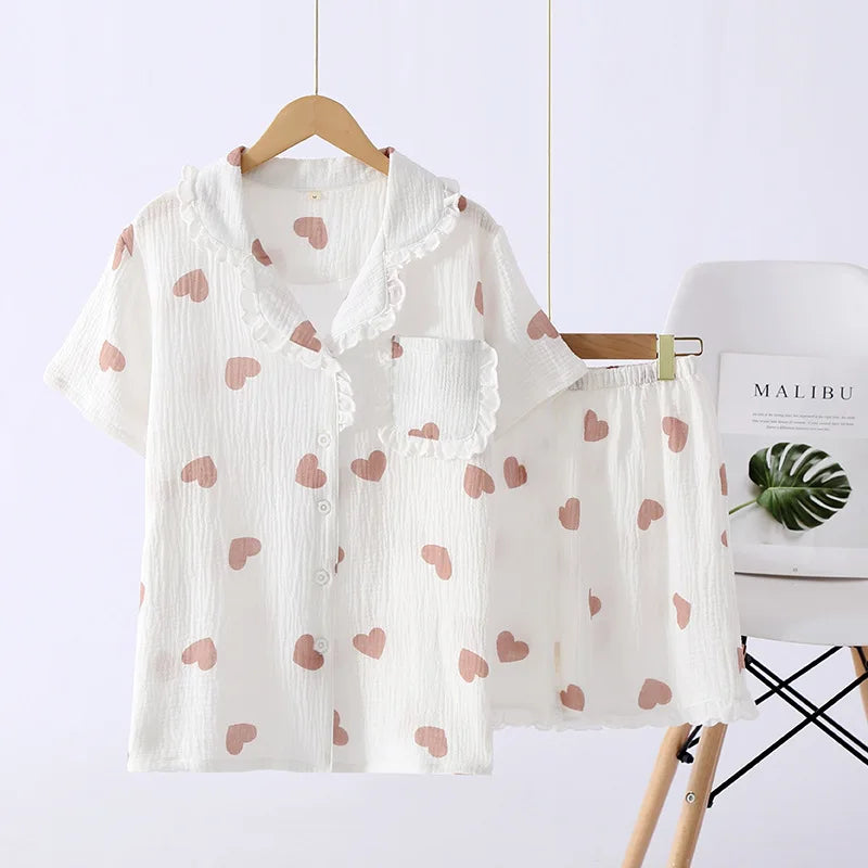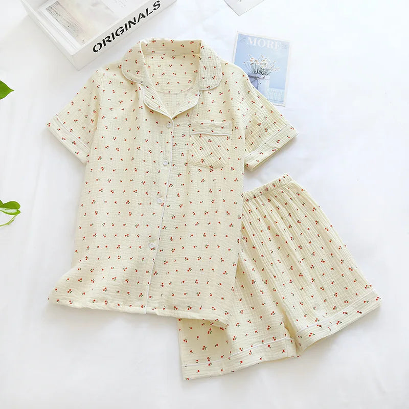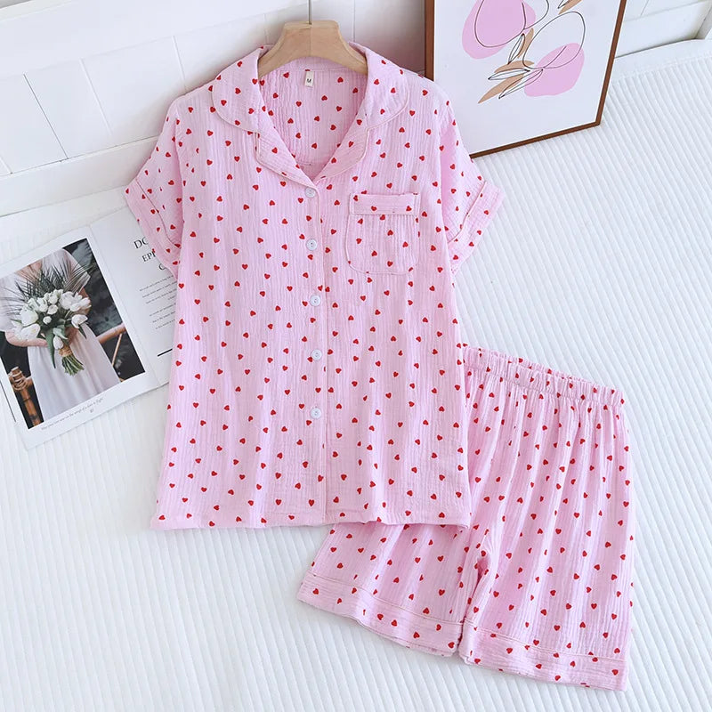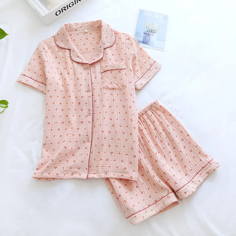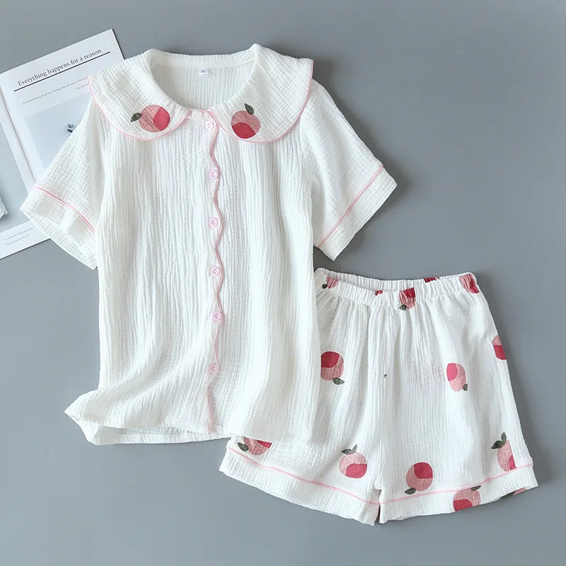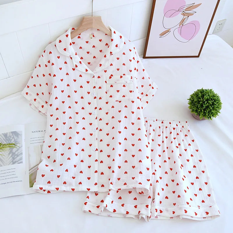 여성 잠옷 세트 여름 편안한 거즈 코튼 턴다운 칼라 잠옷 세트 여성 얇은 느슨한 만화 당근 인쇄 홈웨어