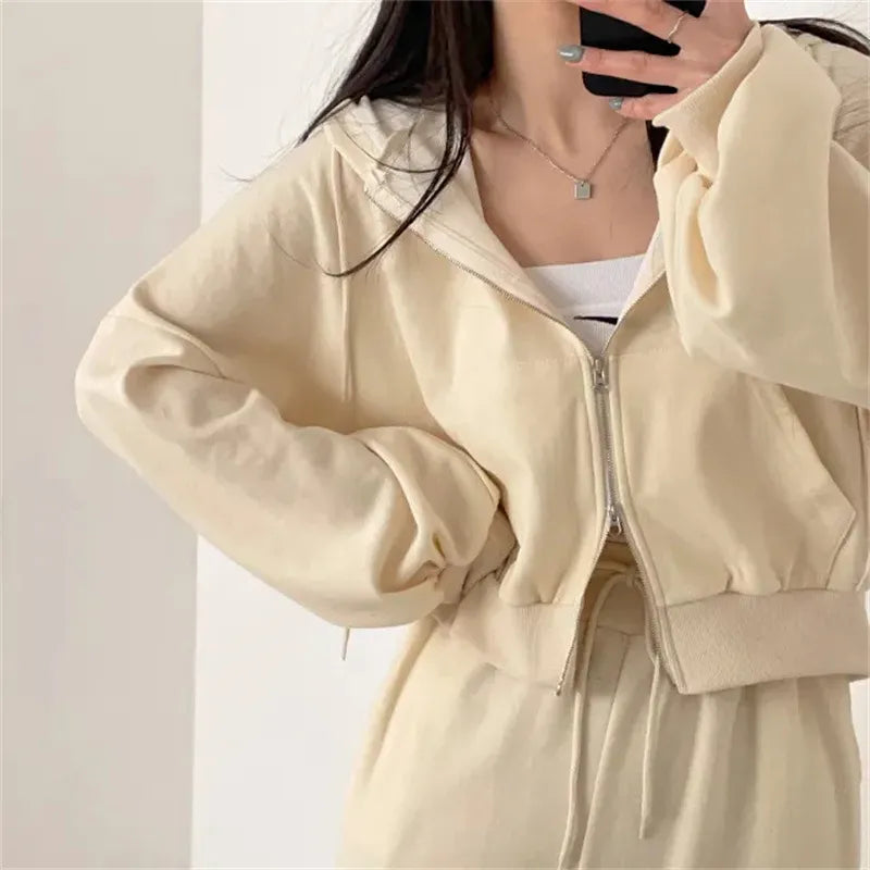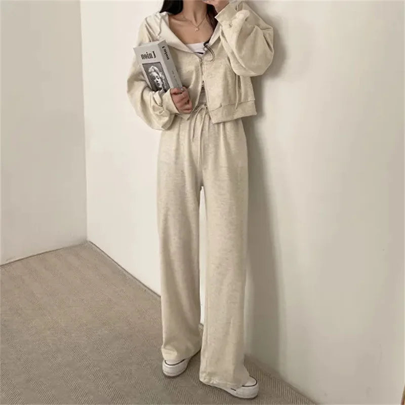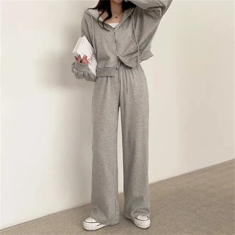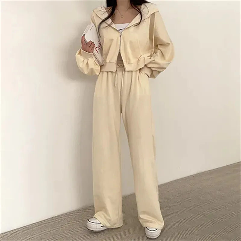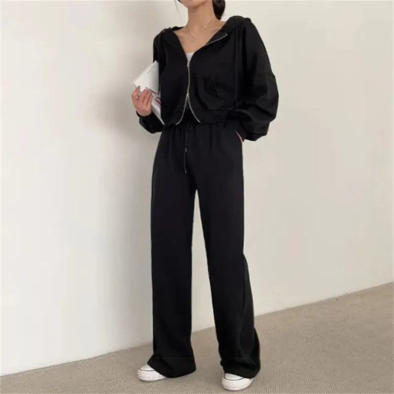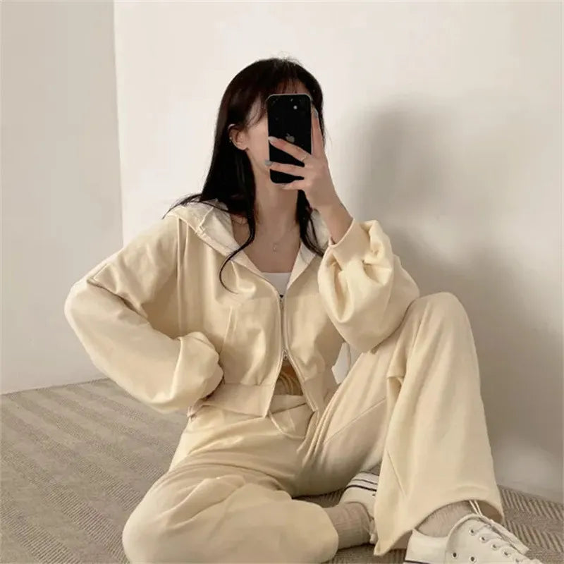 여성 팬츠 슈트 2023 가을 신상품 한국 스타일 긴팔 지퍼 탑 하이웨이스트 캐주얼 여성 루즈 스포츠 2피스 팬츠 세트