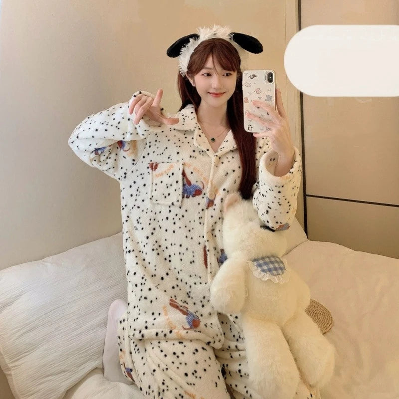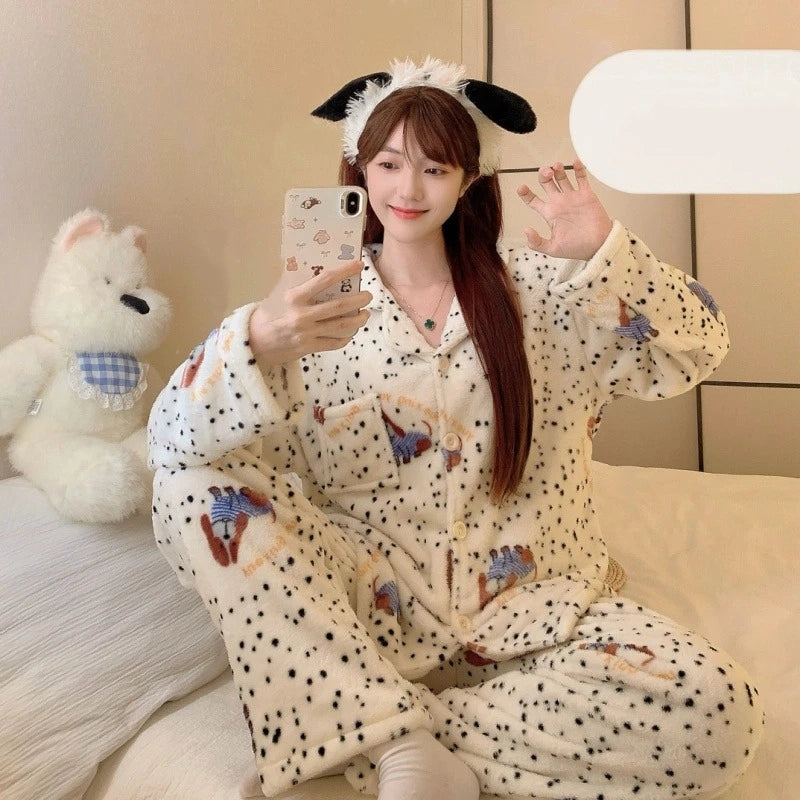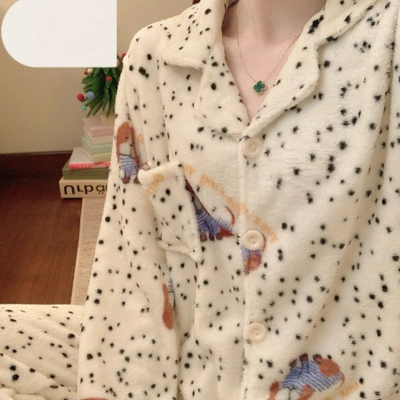 GETADME 플리스 두껍고 따뜻한 여성용 잠옷 세트 겨울 신상품 재미있는 프린트 잠옷 캐주얼 카와이 달콤하고 부드러운 여성용 잠옷 세트 홈 슈트