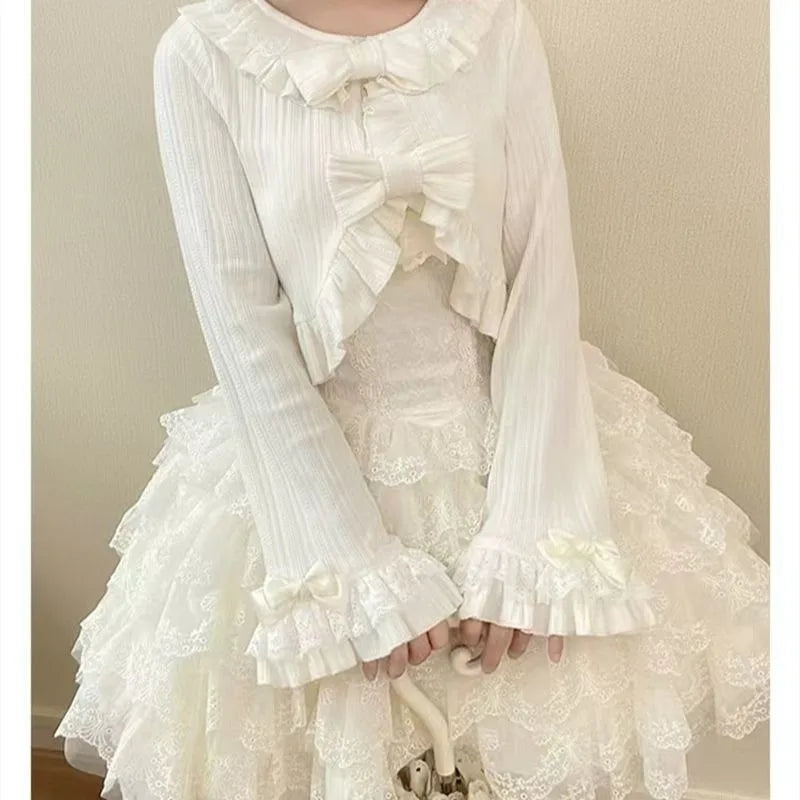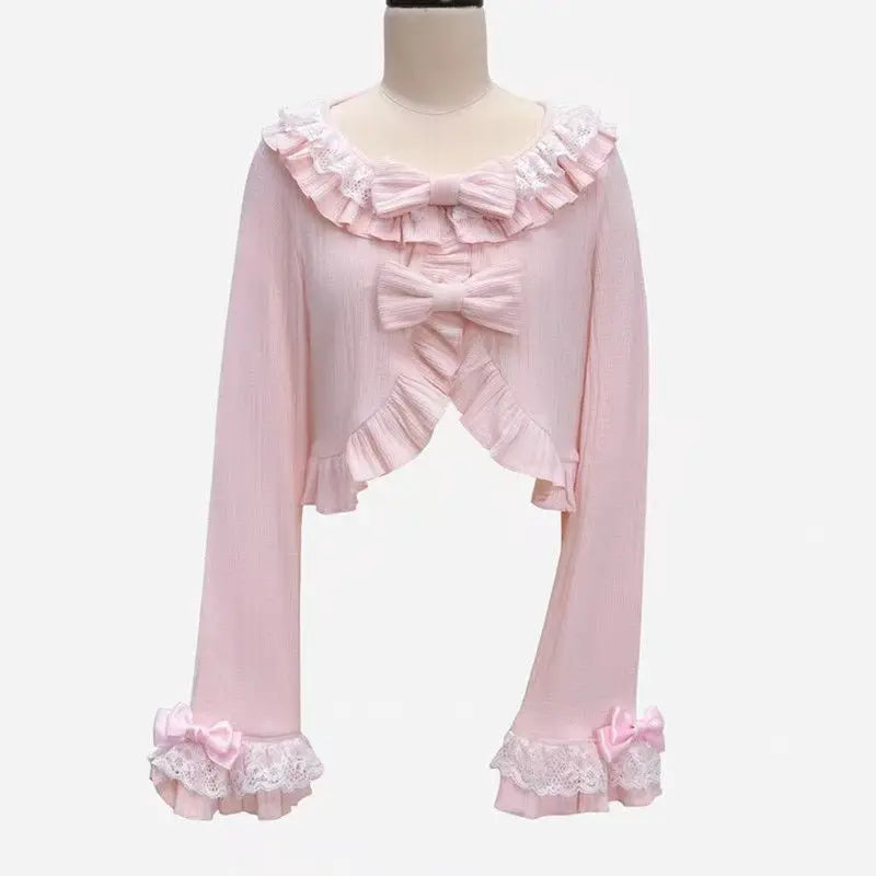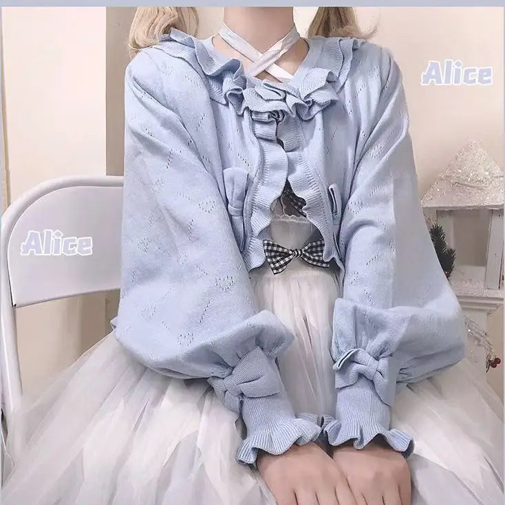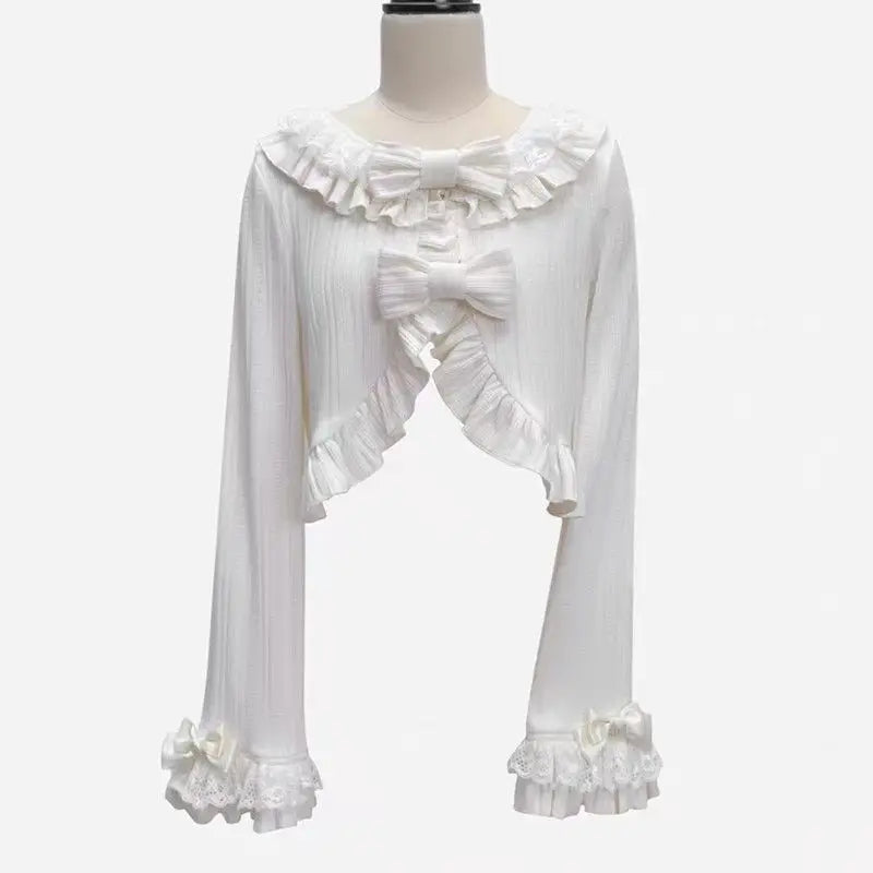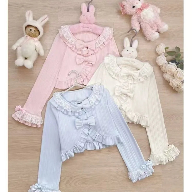 GETADME 카와이 로리타 크롭 니트 가디건, 하트 레이스 오픈워크 스프링 커버업, 일본식 빈티지 스타일 자외선 차단 스웨터