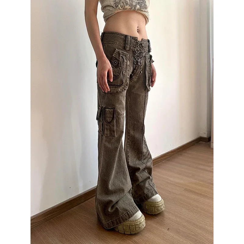 GETADME 스트리트웨어 브라운 고딕 Y2K 청바지 헐렁한 여성 미학 데님 바지 하라주쿠 빈티지 2000년대 촌스러운 카고 팬츠 팬츠
