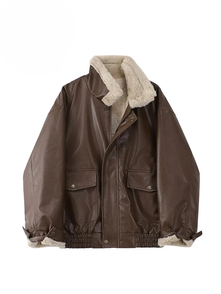 GETADME 겨울 여성용 모피 가죽 재킷 긴팔 루즈 웜 램 울 빈티지 두꺼운 기관차 라펠 여성용 PU 모터사이클 코트
