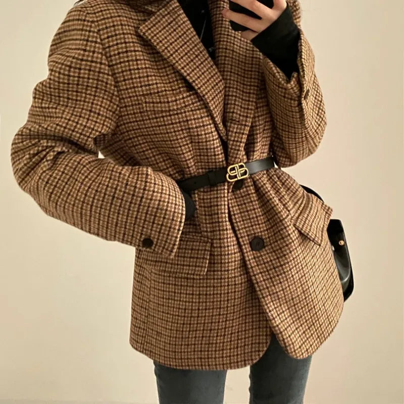 Getadme 2 Winter Vintage Plaid Single Breasted Notched Collar Loose Jacket Autumn Women Office Lady Outerwear Fashion Baggy Coat