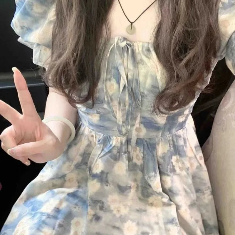 Getadme-2024 summer new French square collar bubble sleeve floral dress holiday style waist A-line skirt