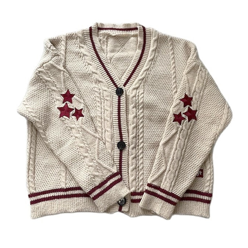 Getadme- Vintage Loose Slight Stretch Cardigan Fashion Star Embroidery Tay Women Warm Soft Sweater Ladies Casual V-neck Knitted Top