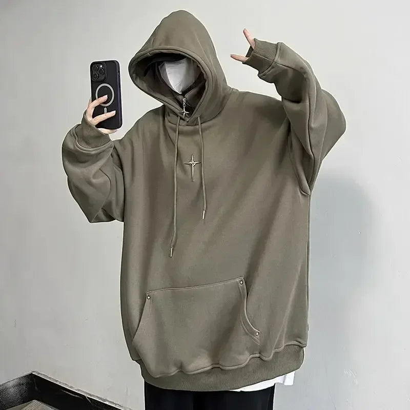 Getadme-American Style Retro Design Sense Four Pointed Star High Collar Hooded Sweater for Men and Women Trend Winter Thick Top Coat