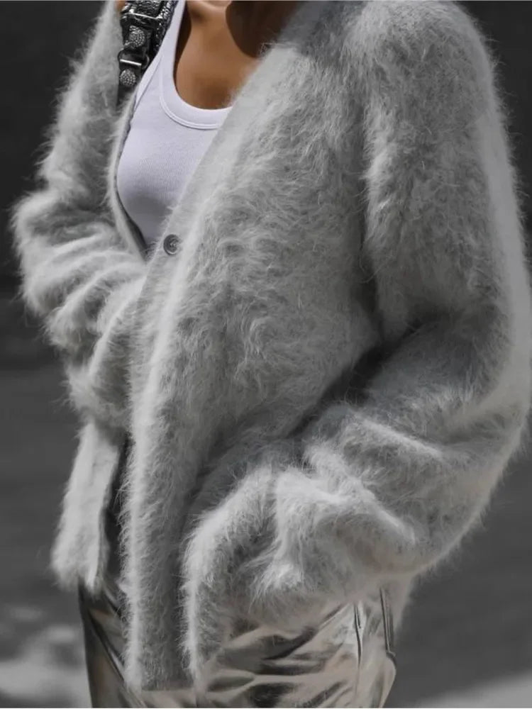 Getadme Angora Wool V-neck Knit Cardigan For Women Elegant Chic Single Breasted Short Sweater 2024 Spring Solid Warm Long Sleeve Jumper