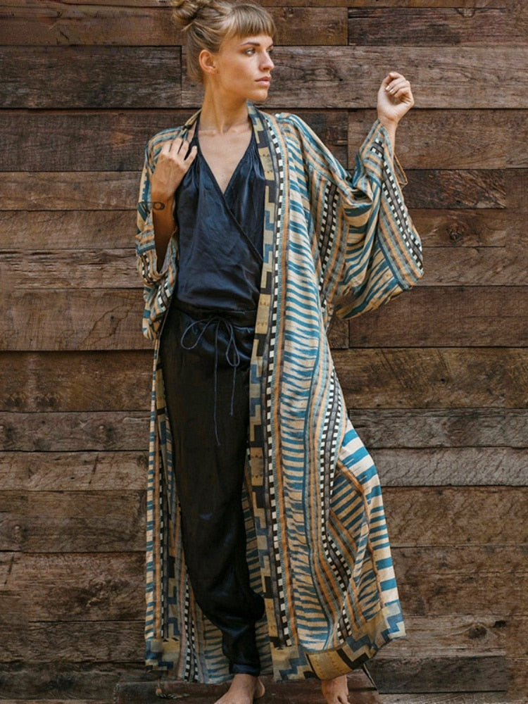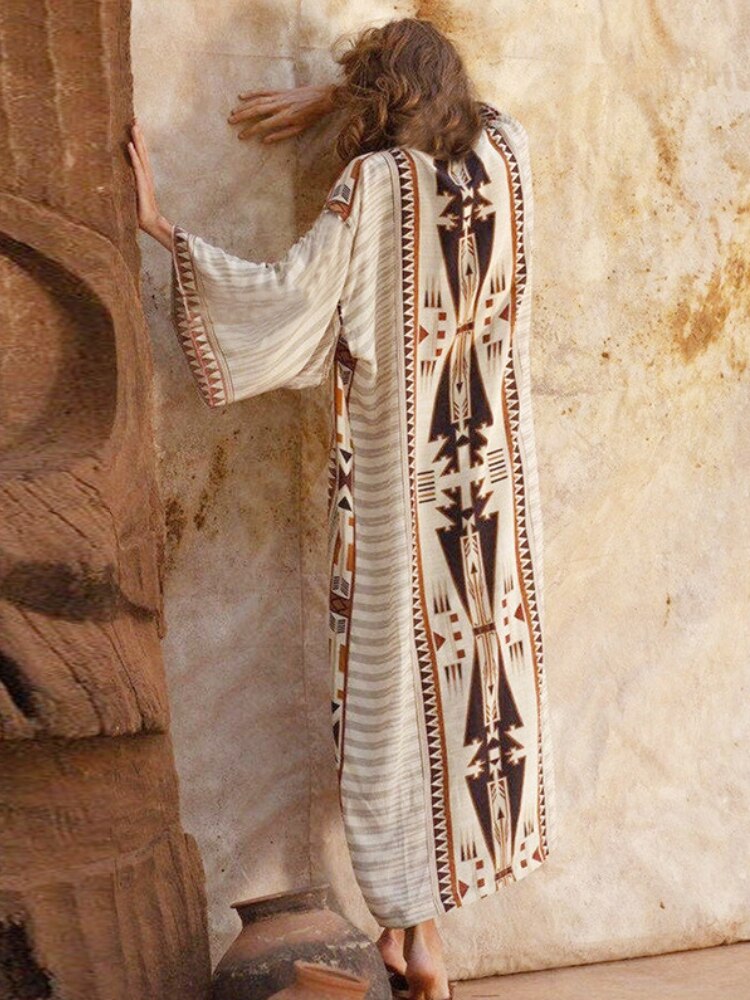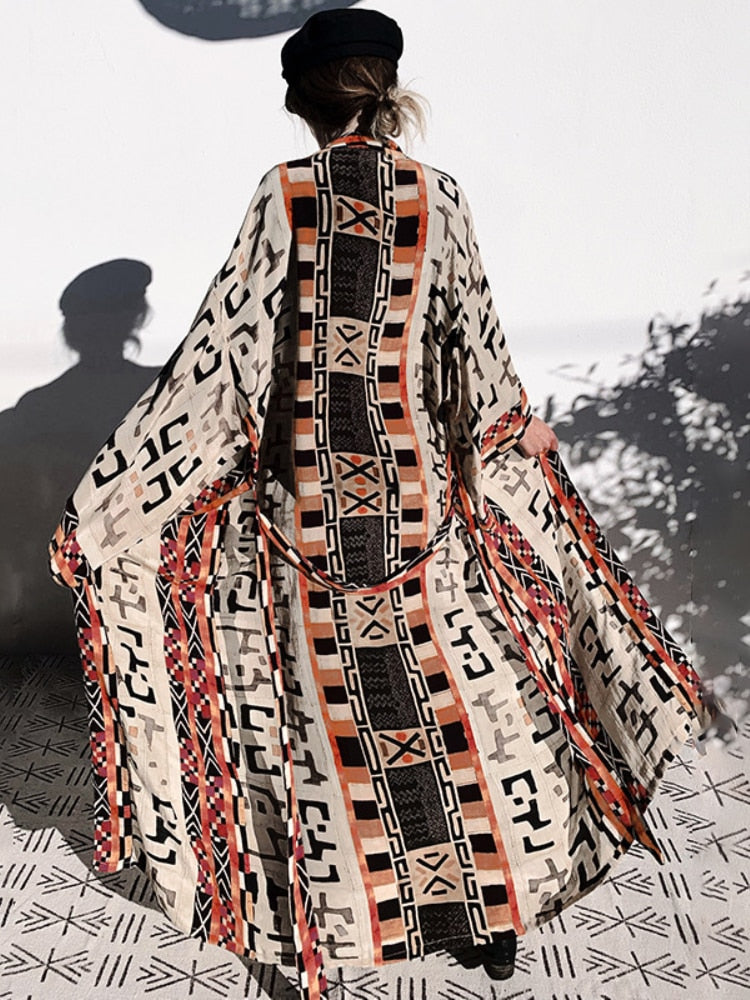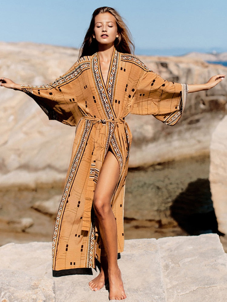 Getadme-Bikini Cover Up Vintage Geometric Printed Beach Kimono Dresses Self Belted Loose Swimwear Bathing Suits Various Style Sales
