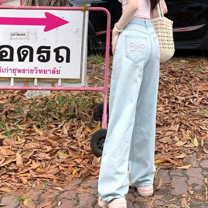 Getadme-Blue Jeans for Women High Quality High Waist American Wide Leg Pants Bow Embroidery Y2K Vintage Straight Summer Trousers