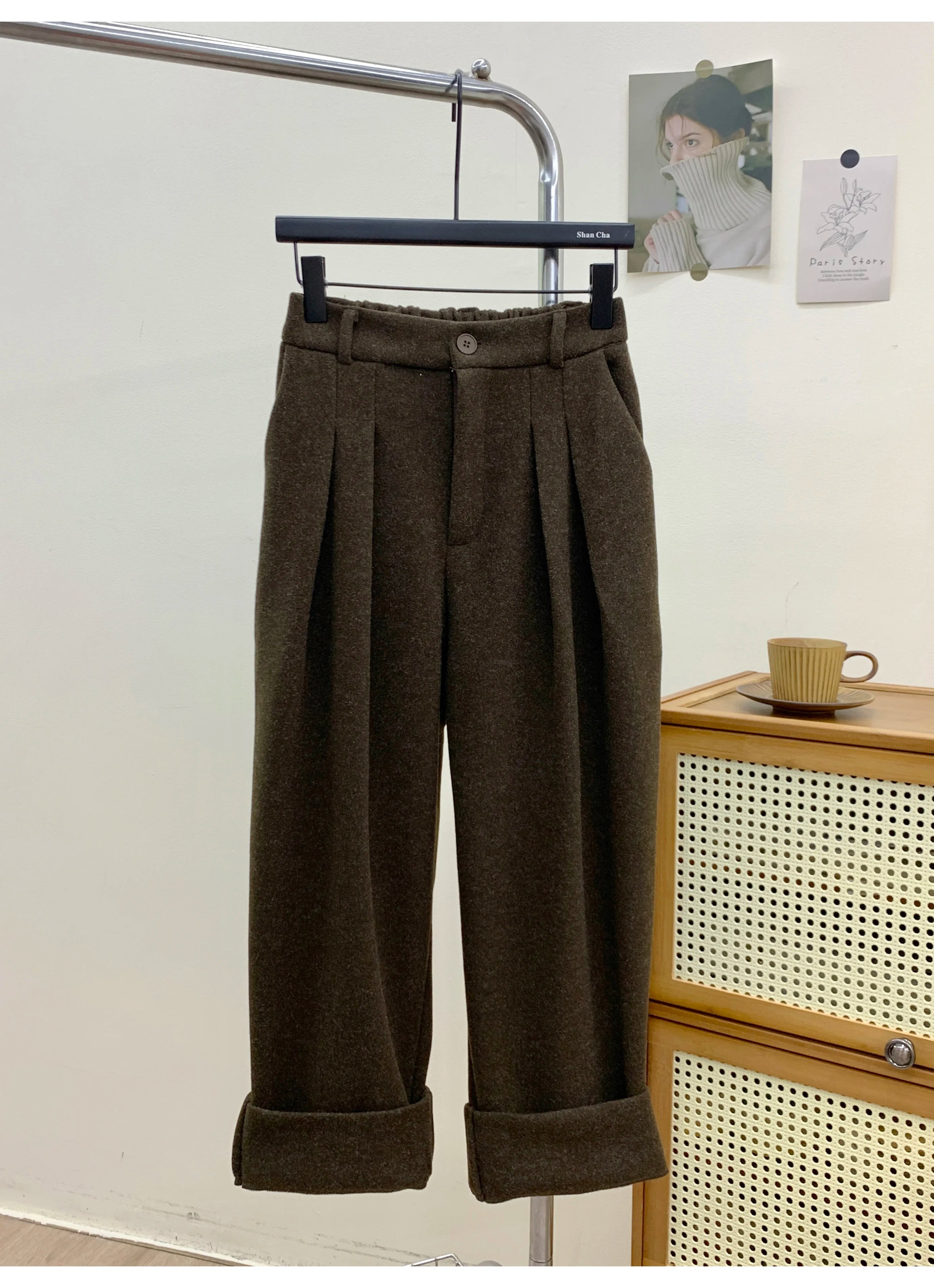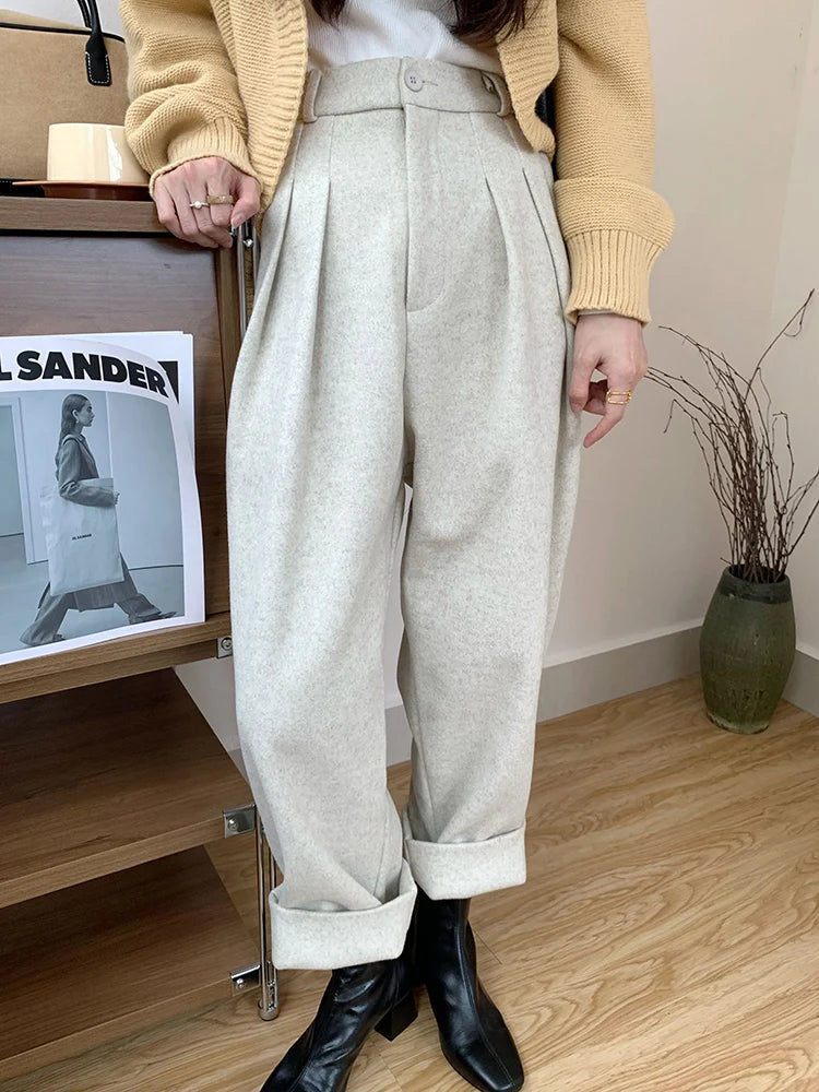 Getadme-Chic Women Casual Loose Pockets Woolen Suit Pants Autumn Winter High Waist Thicken Korean Ladies Solid Harem Trousers