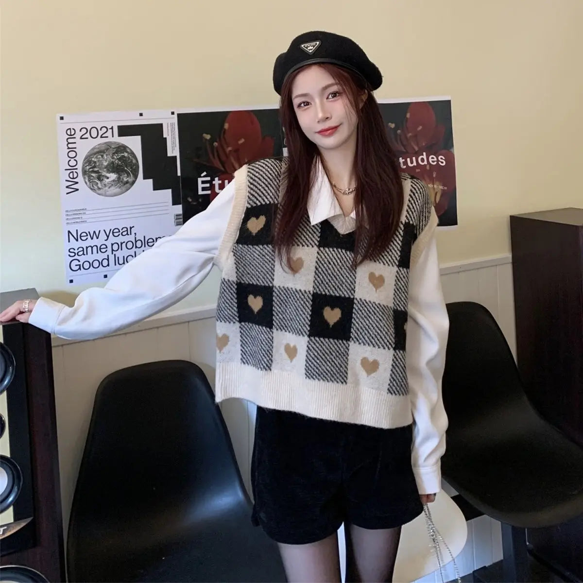 Getadme-Cute Checkered Sweater Vests Women Sweet V-neck Female Ulzzang Heart-knitted Sleeveless Sweaters Tricot Jumpers Retro Students