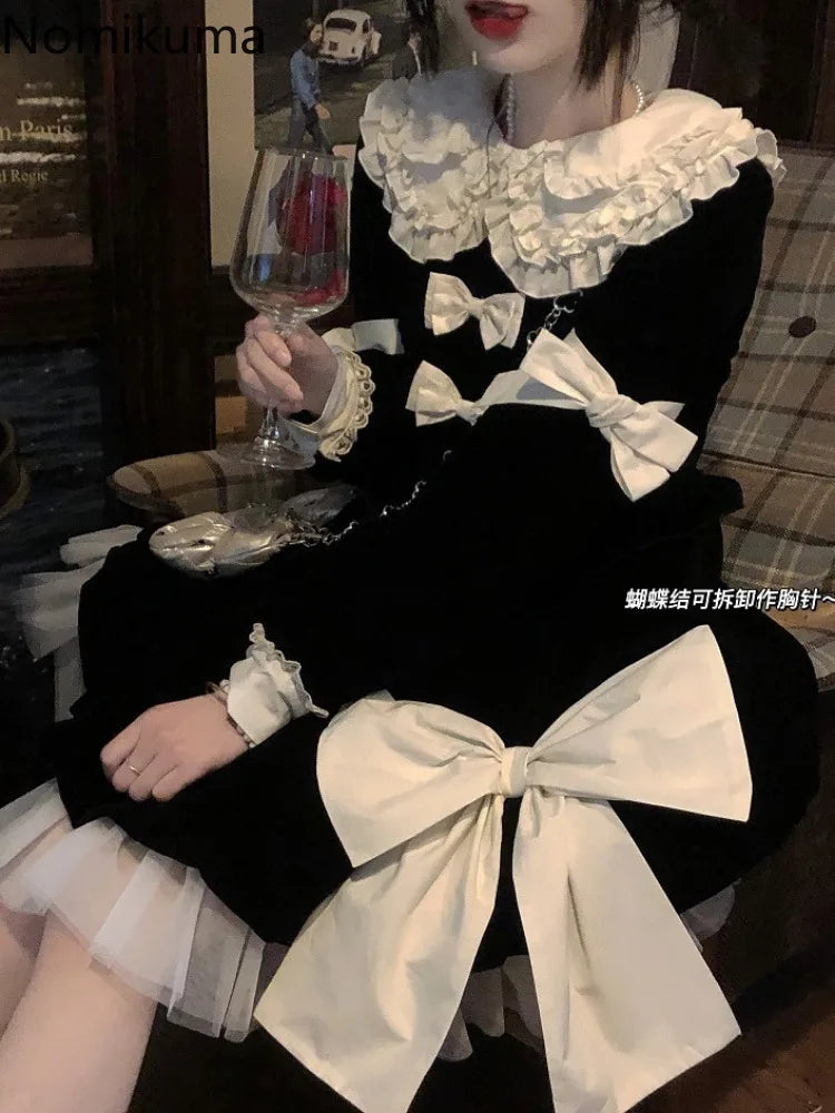 Getadme-Cute Dresses for Women Sweet Peter Pan Collar A-line Black Robe Femme 2024 Vestidos De Mujer Bandage Bow Velvet Vintage Dress