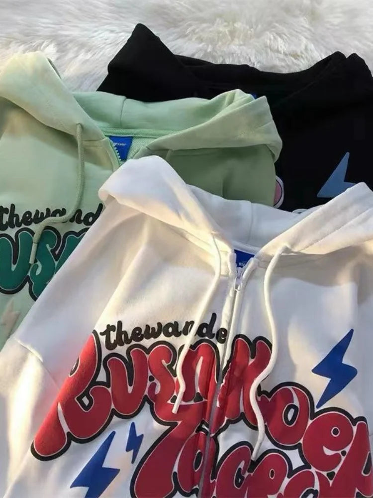 Getadme-American Retro Zip Up Graphic Hoodies Women Streetwear Loose Letter Printed Hooded Sweatshirts Hiphop Thin Top