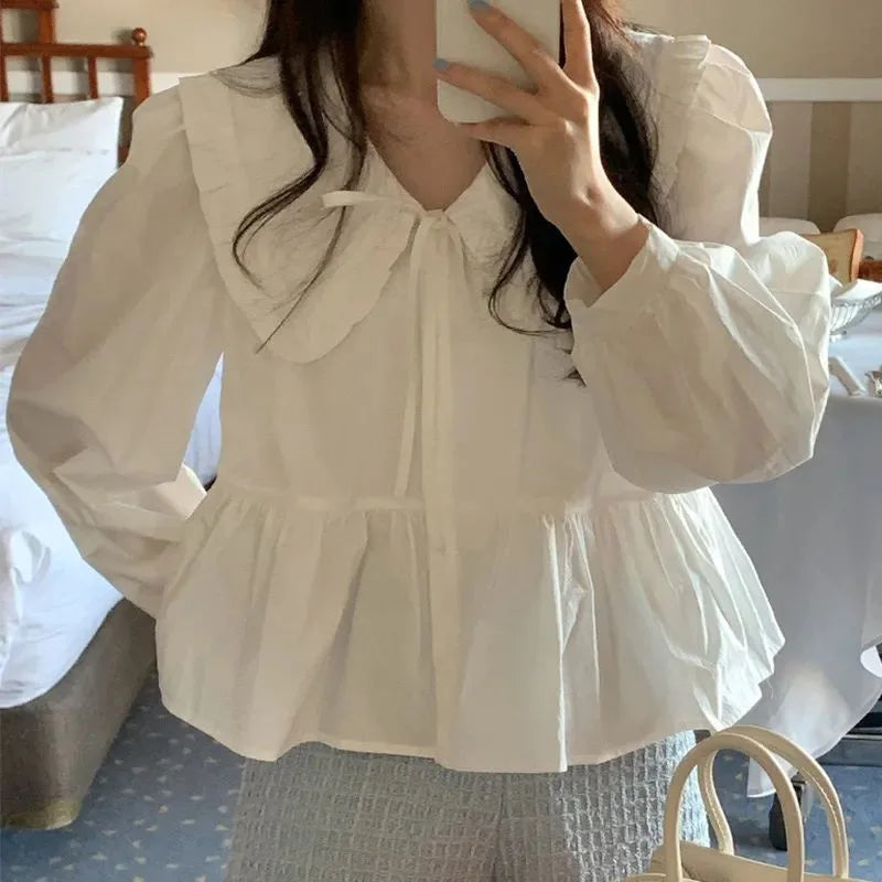 Getadme-Doll Collar Shirt Women Loose Cute Lace Up French Tops Female Spring Summer Fashion Long Sleeves Solid White Shirts Lady