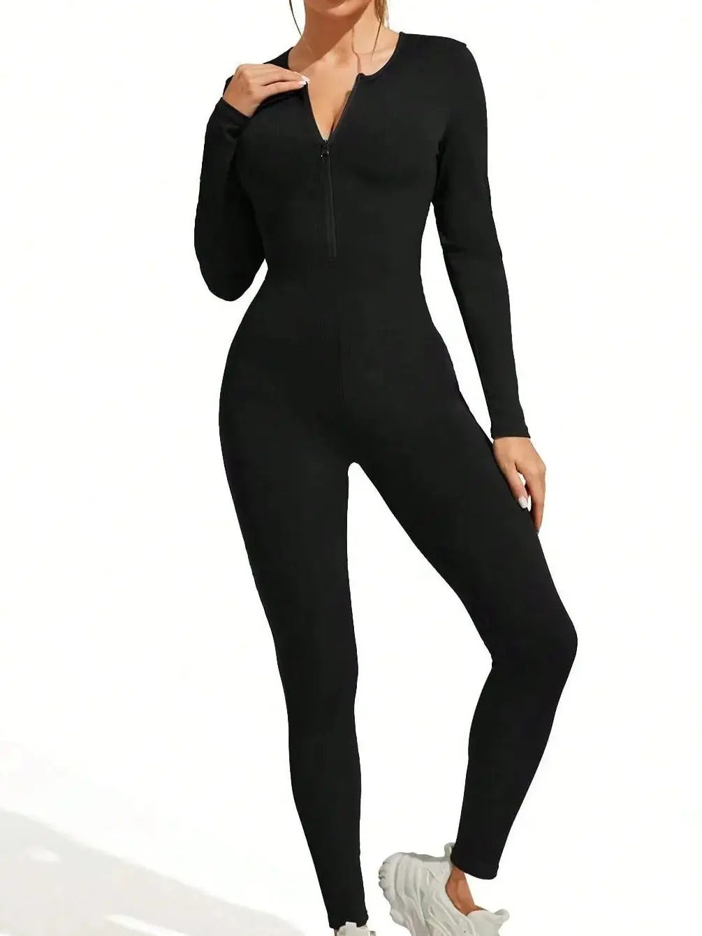 Getadme Fall new hot sale sexy bodysuit for women solid color ribbed long sleeve zipper bodycon sporty clothing rompers women's jumpsuit