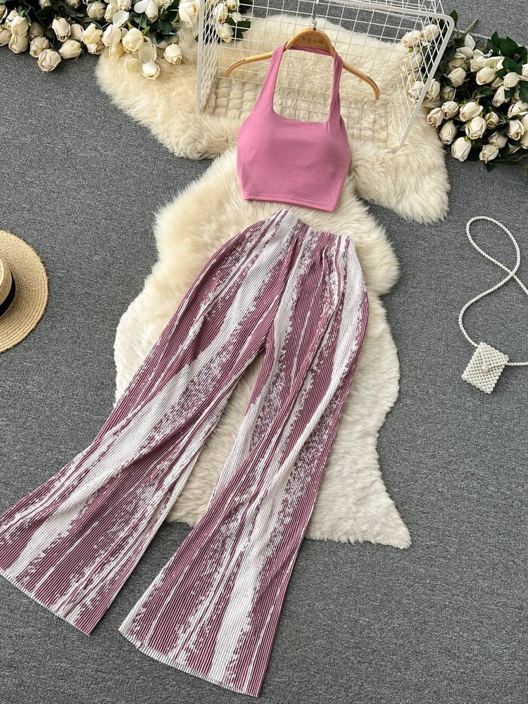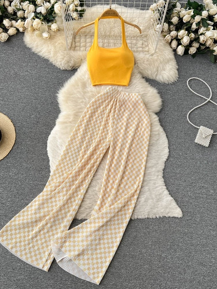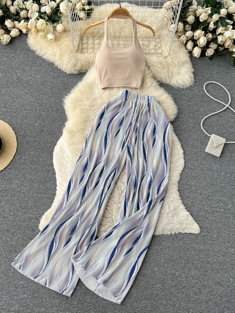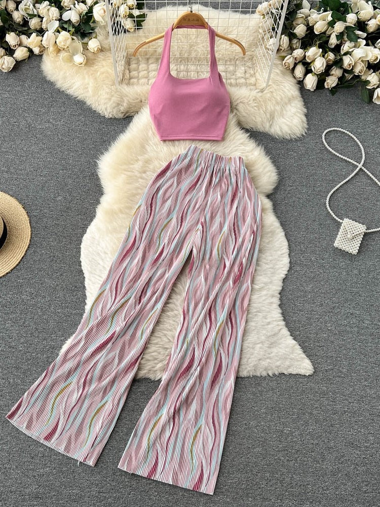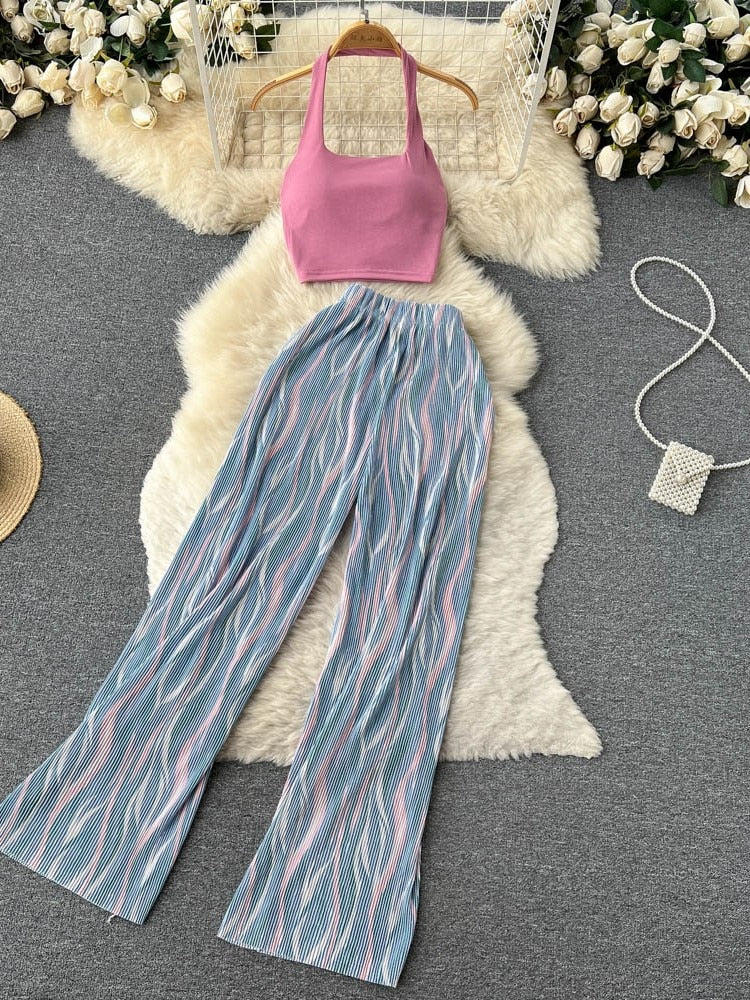 Getadme Fashion New Women Summer Sexy Pants Set Halter Tank Tops Wide-leg Long Pantsuit Female Slim Vacation Two Piece Sets