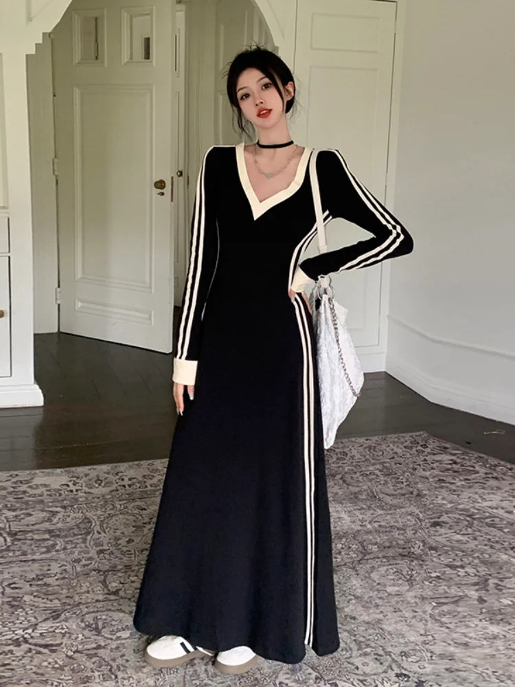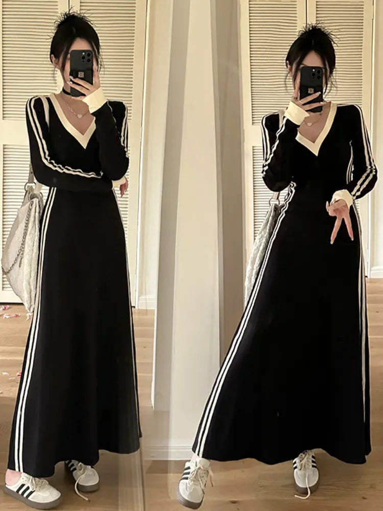 Getadme-French Striped V-neck Long-sleeved Dress Women Fall Clothes Vintage Robe Casual Loose Dresses Korean Fashion Vestidos De Fiesta