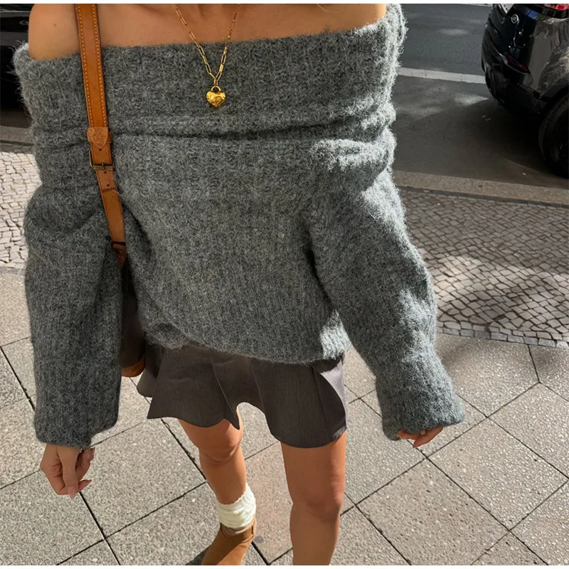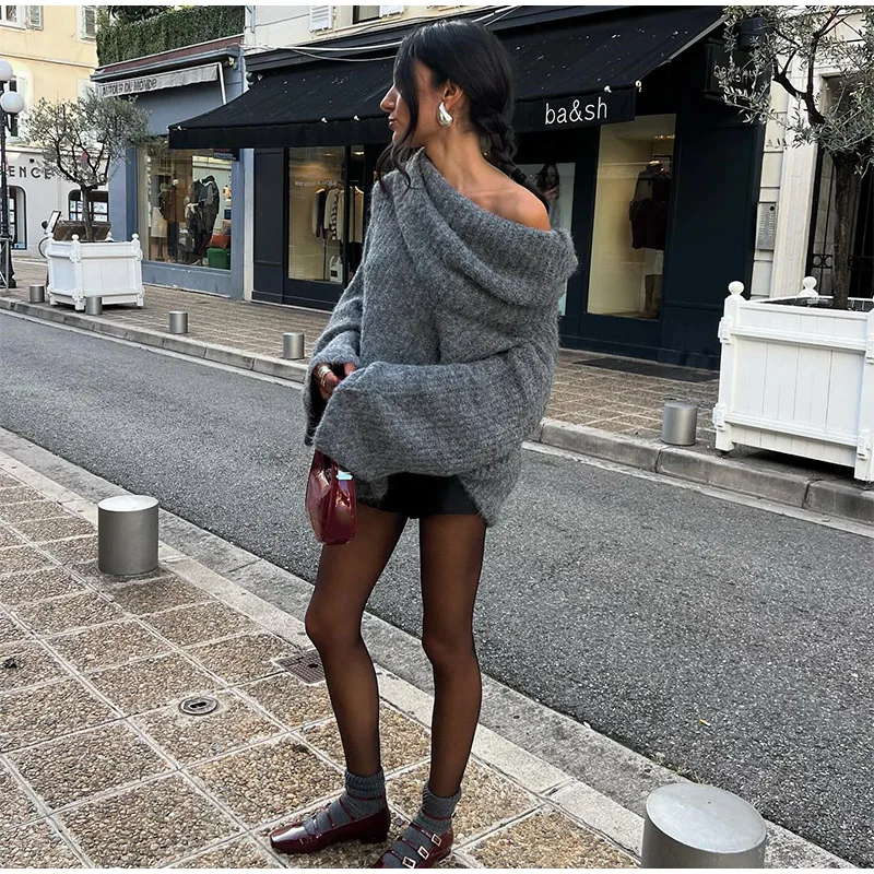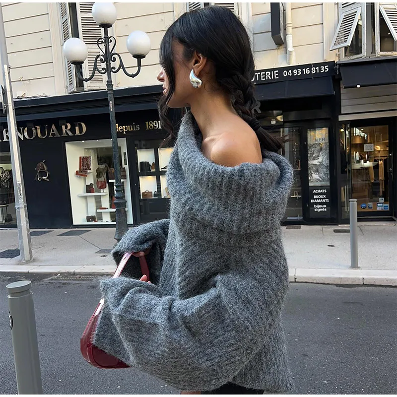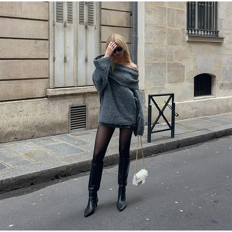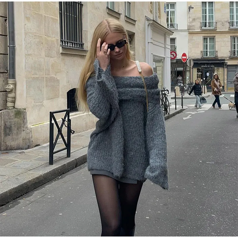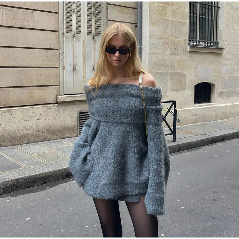 Model Number : 2024 Elegant Grey Off Shoulder Women's Loose Sweater