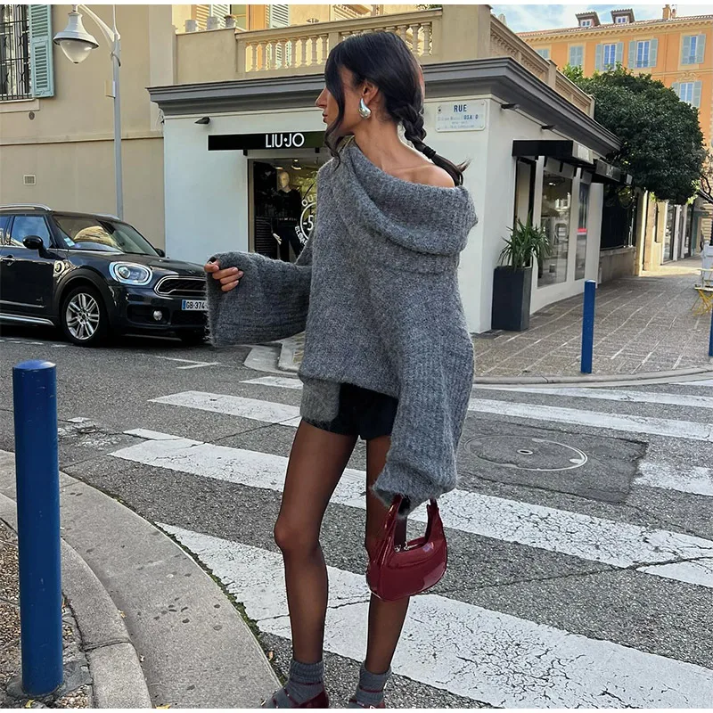 GETADME 2024 Elegant Grey Off Shoulder Women's Loose Sweater Fashion Autumn Casual Long Sleeves Knitted Pullover Lady Chic Street Jumper