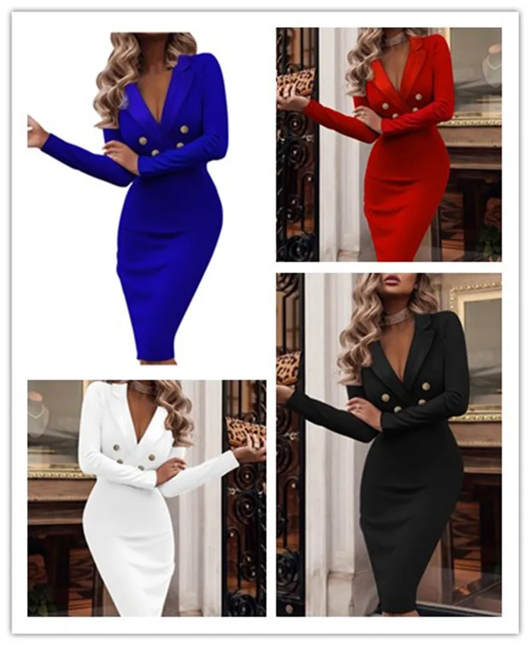 GETADME 2025 Autumn Winter Solid Color V-neck Double Breasted Suit Package Hip Dresses For Women Elegant Office Ladies Bodycon Dress
