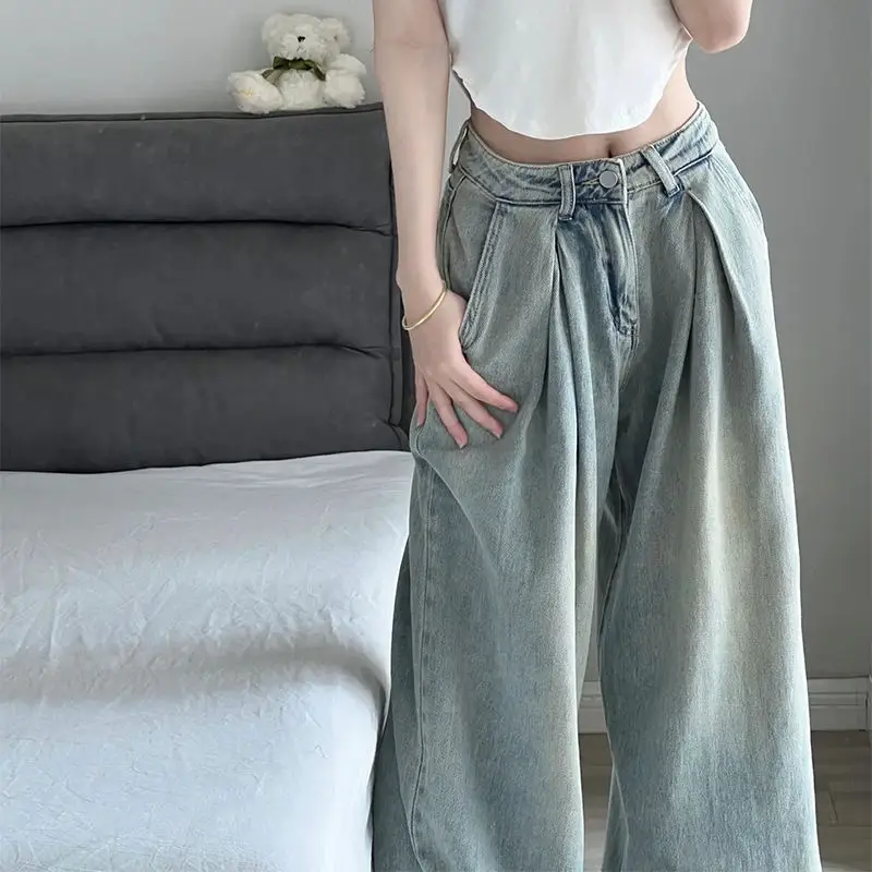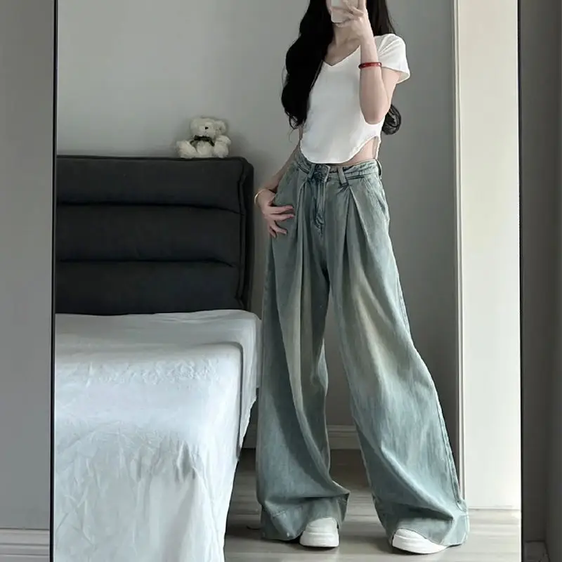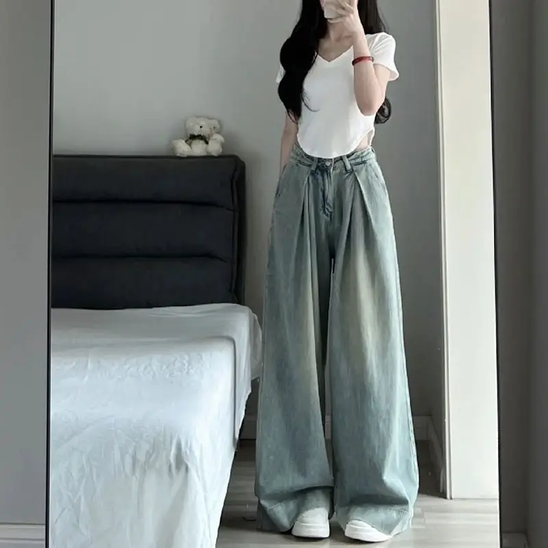 GETADME 2025 Blue Straight Jeans Women Korean Fashion Streetwear High Waist Wide Leg Denim Pants Female Loose Mopping Jean Trouser Y2K