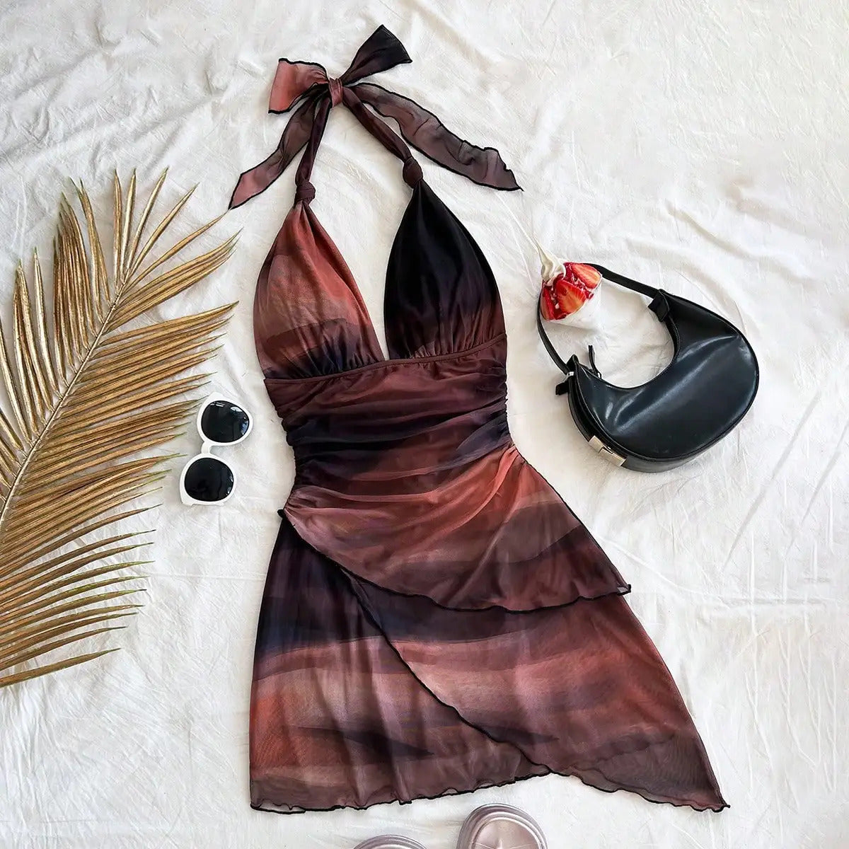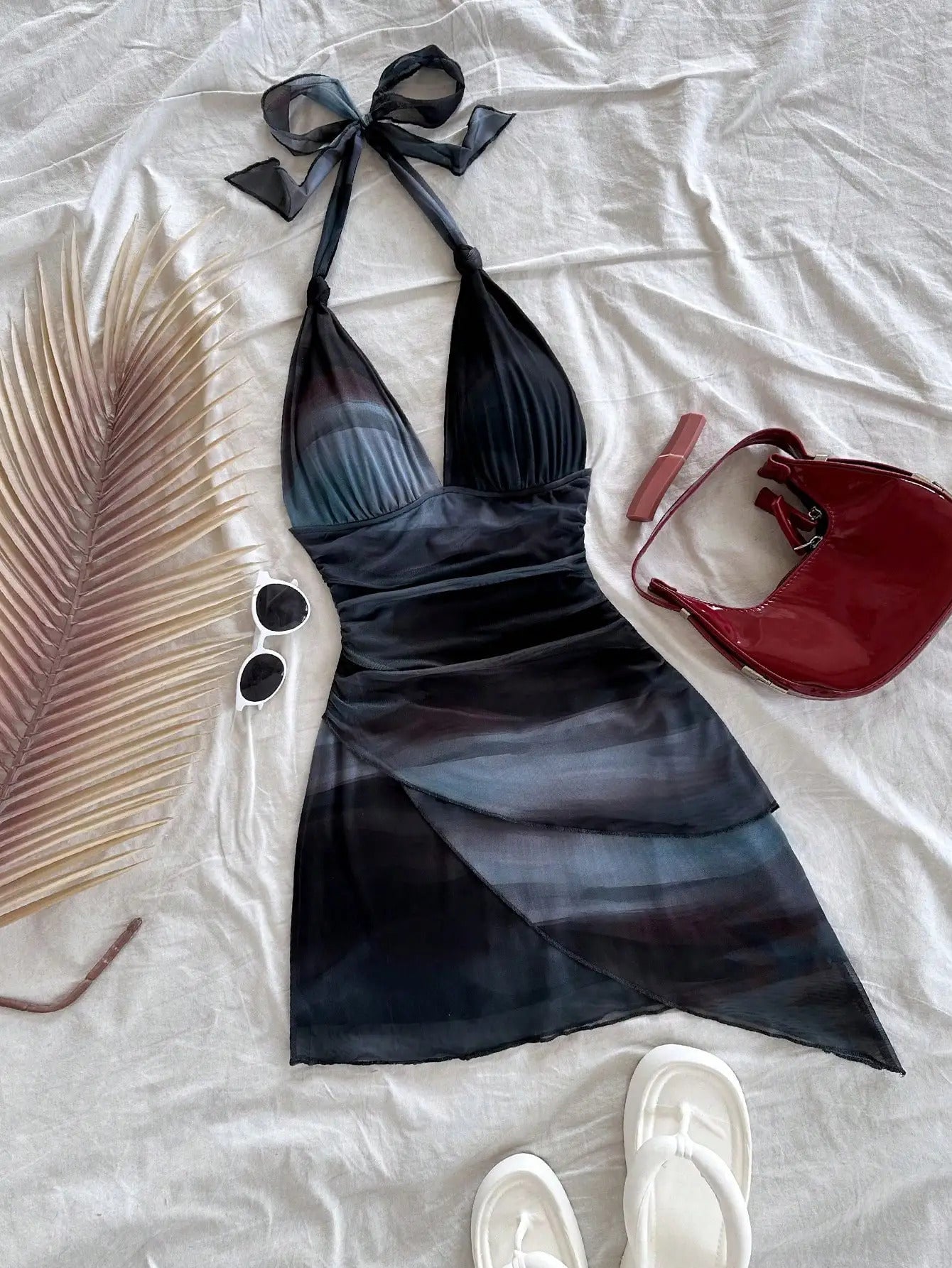 GETADME-2025 Europe and the United States Fashion Gauze Printed Neck Sleeveless Sexy Tight Deep V Short Sexy Pure Backless Dress