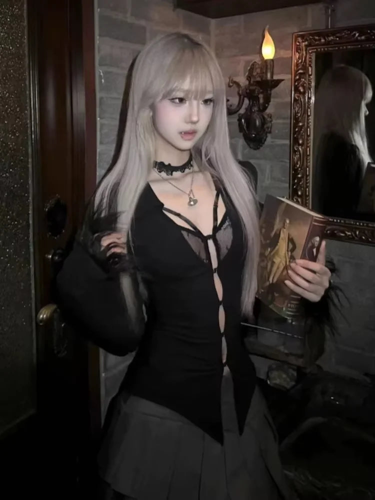 GETADME 2025 New Black Y2k Crop Tops Sexy Blouses Women Spicy Girl V-neck Zipper Shirts Long Sleeve Tunic Casual Design Slim Chic Tops