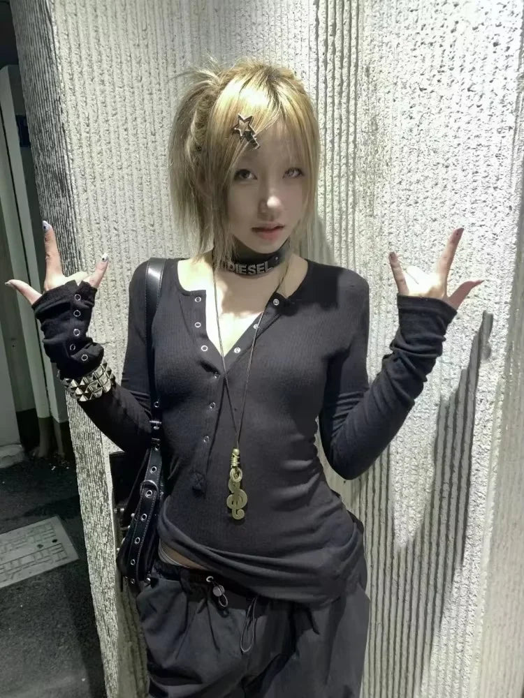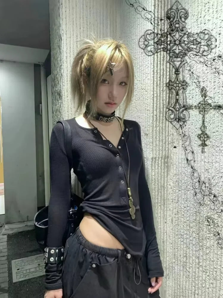 GETADME 2025 New Black Y2k Crop Tops Sexy Blouses Women Spicy Girl V-neck Zipper Shirts Long Sleeve Tunic Casual Design Slim Chic Tops