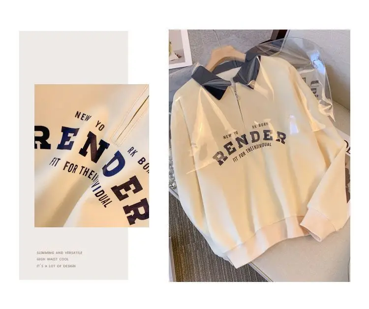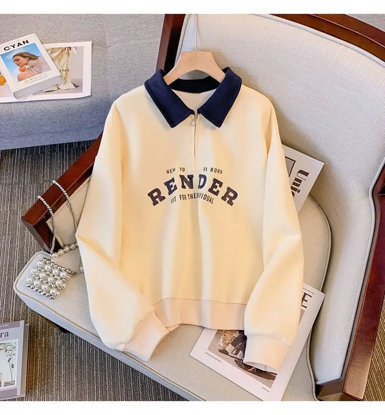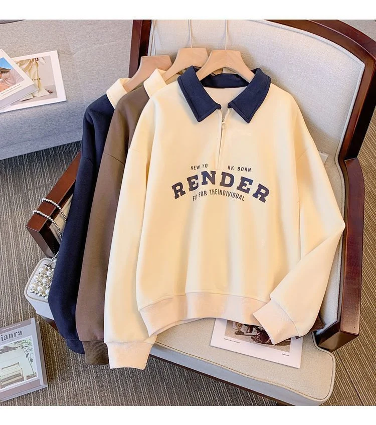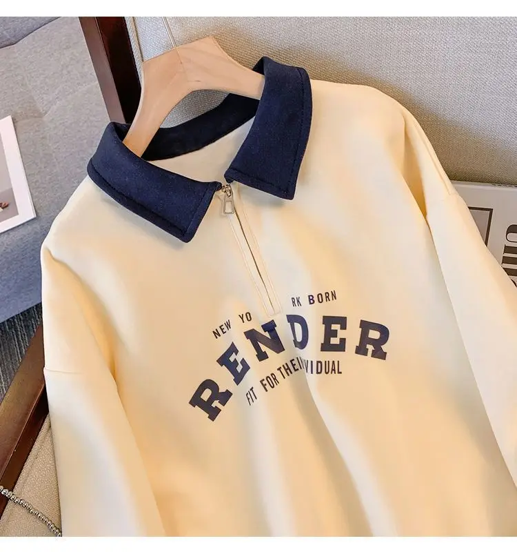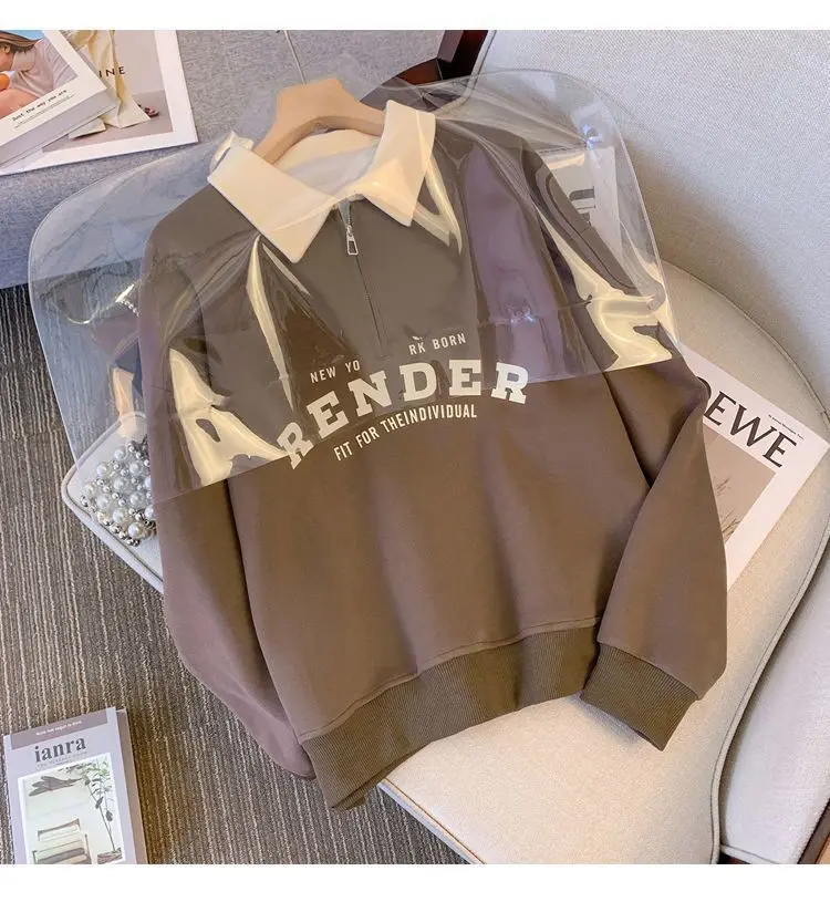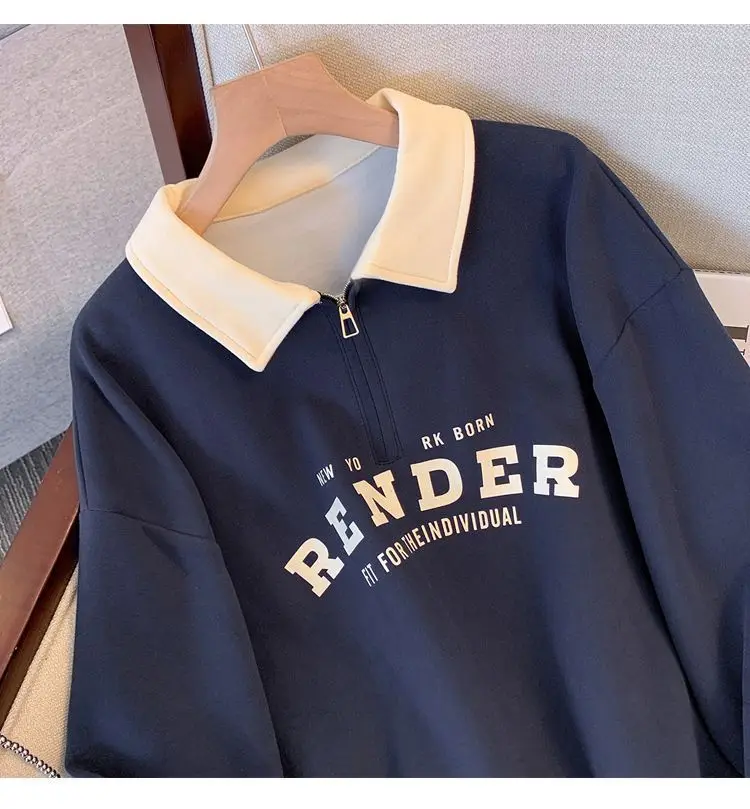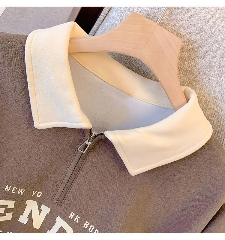 GETADME 2025 New Spring and Autumn American Retro Loose Relaxed Half Zipper Polo Neck Letter Print Oversized Long Sleeve Women's Sweater