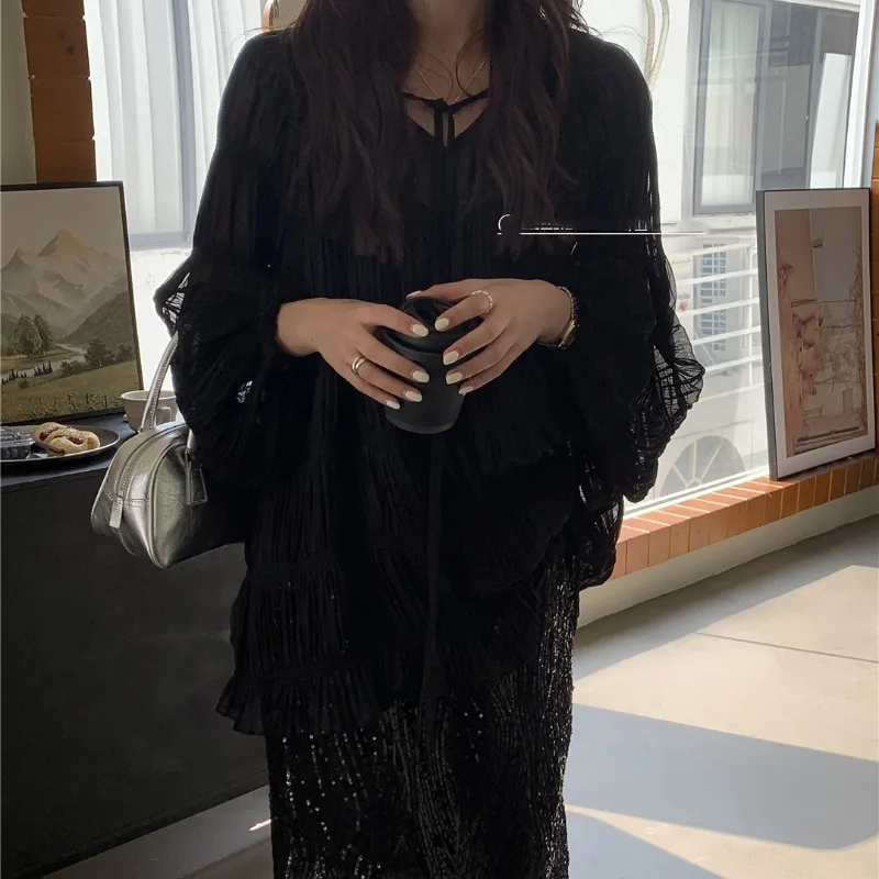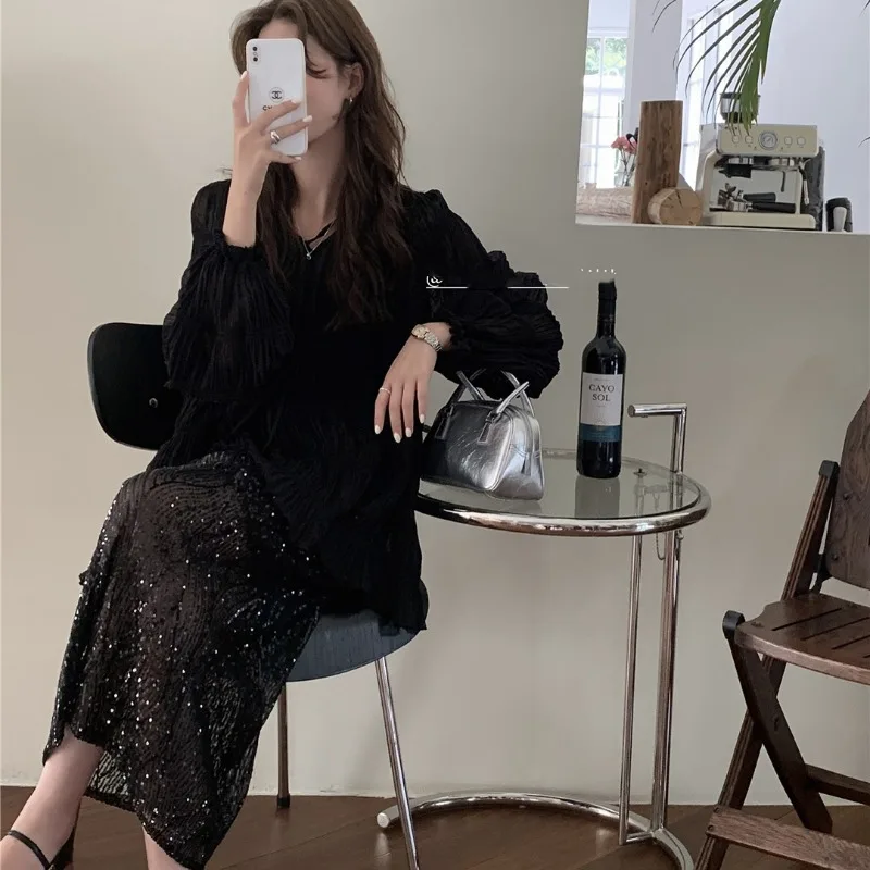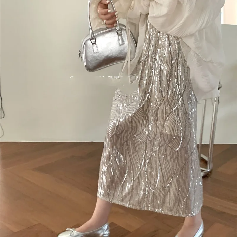 GETADME 2025 New Temperament Women's Spring/Summer Solid Color Sequins Fashion Elegant Versatile Slim Fit Split Bag Hip Long Skirts
