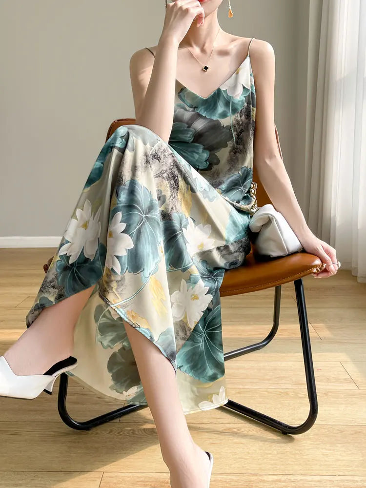 GETADME 2025 Spring and Summer New Women's Dress Colorful Flower Suspender Skirt Satin Silky Dress Cool and Comfortable