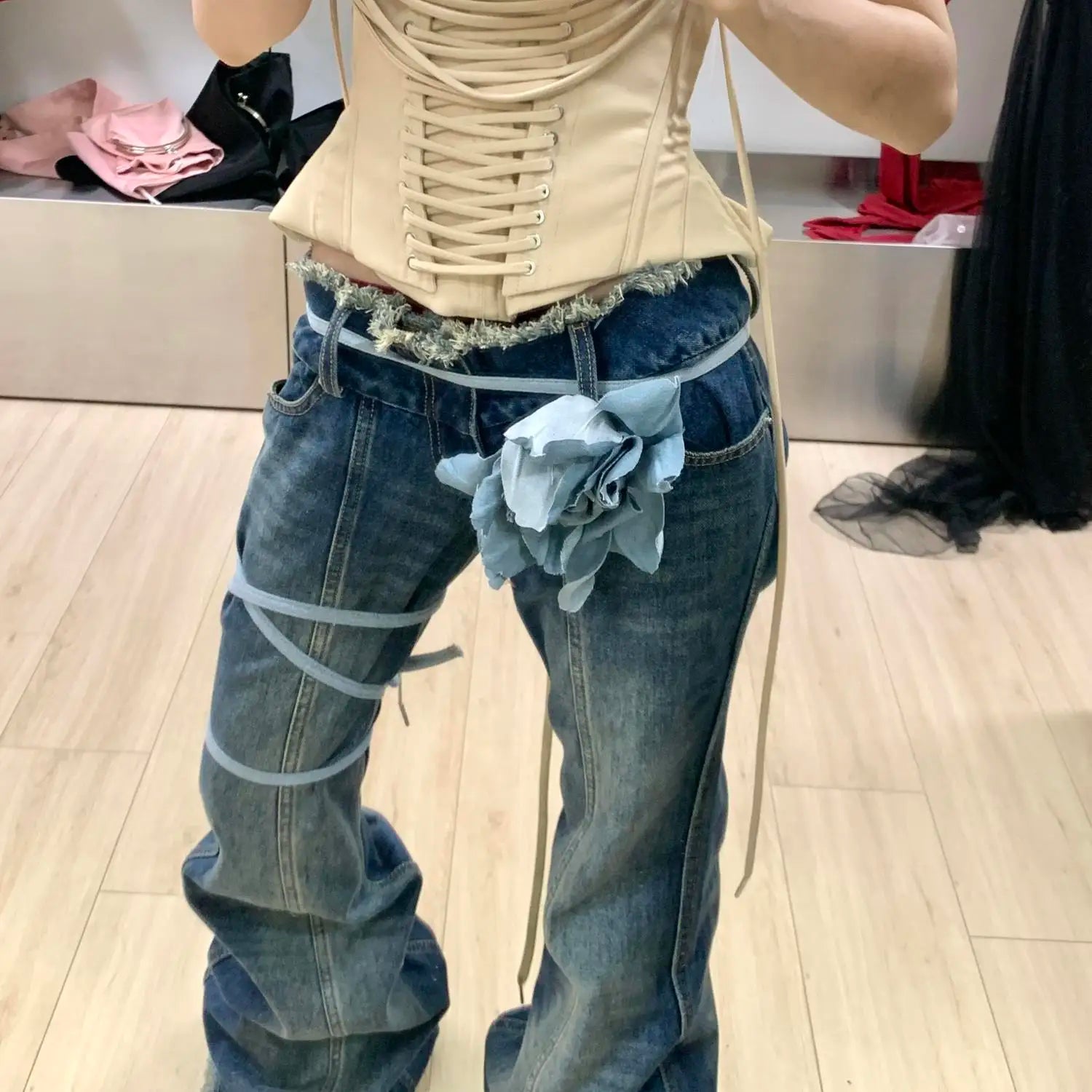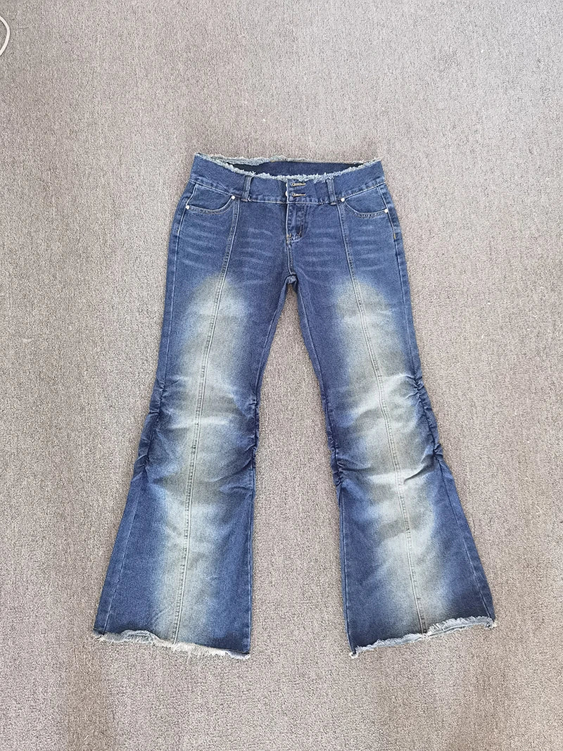 GETADME 2025 Spring Autumn Vintage Style Ruched Denim Flared Pants for Women Y2K Aesthetic Low Waist Slim Fit Bell Bottom Jeans Fashion