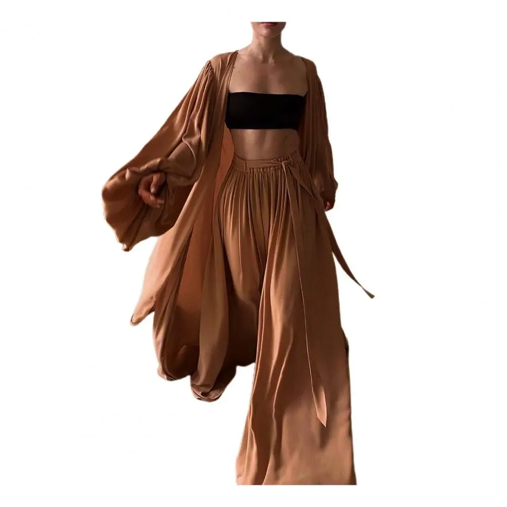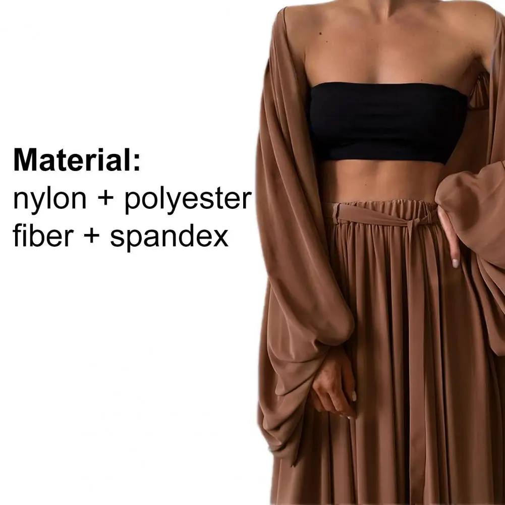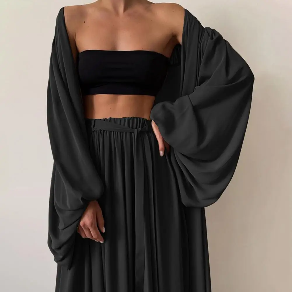 Women Outfit Solid Color Long Sleeve Cardigan Tube Top Wide Leg Pants Three Pieces Set Tracksuit for Party