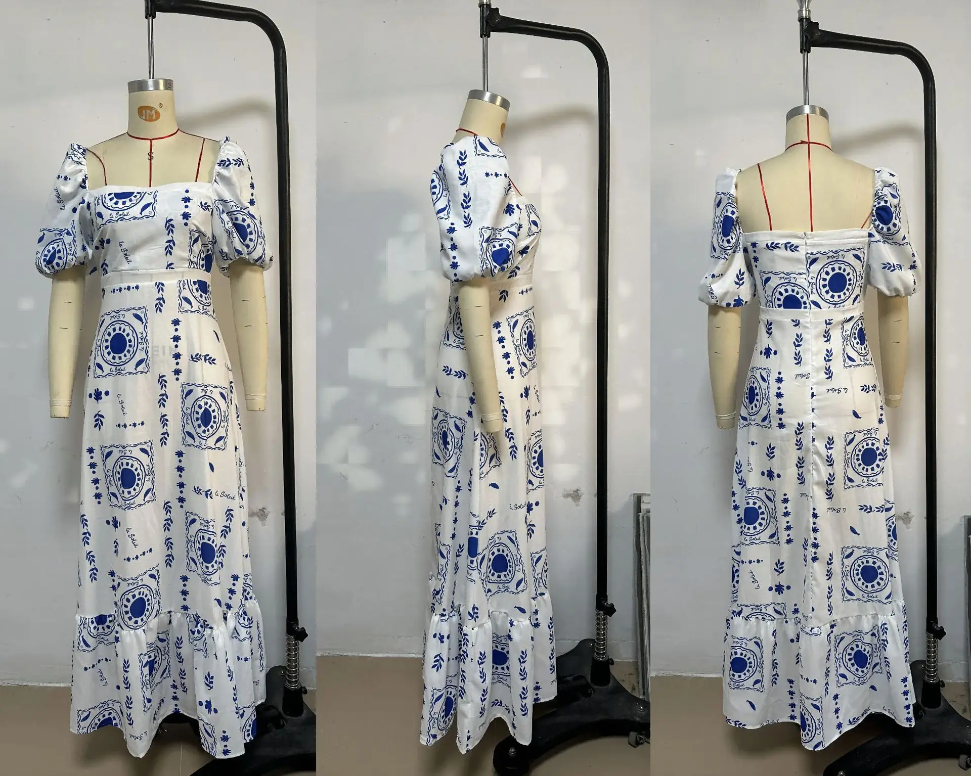 GETADME 2025 Summer Fashion New Women's Elegant Bohemian Dress with Printed Temperament One Collar Lantern Sleeve Long Dress