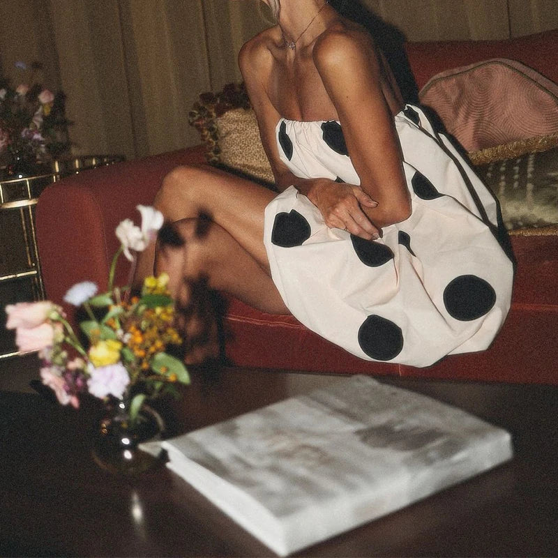 GETADME 2025 Summer Off Shoulder Strapless Dot Printing A-line Mini Loose Dresses Women Fashion Cute Club Elastic Robes