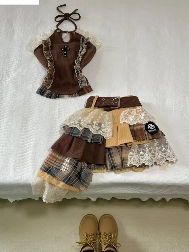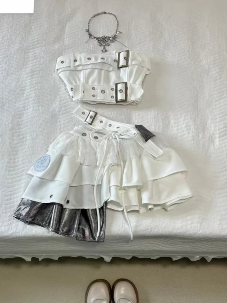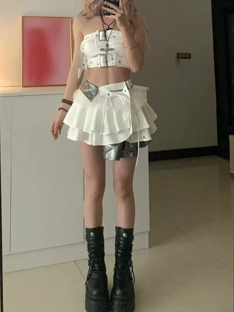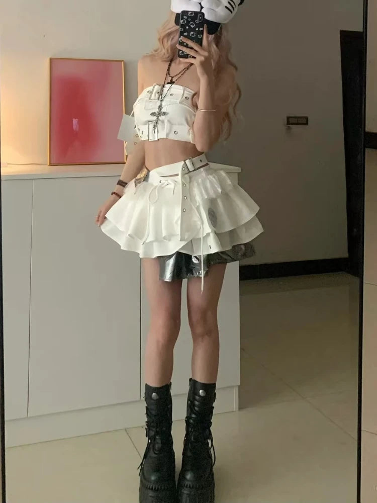 GETADME 2025 Vintage Summer Elegant Y2K Woman 2 Piece Sets Punk Gothic Strapless Crop Tops +High Waist Ruffle Skirt Female Party Outfits