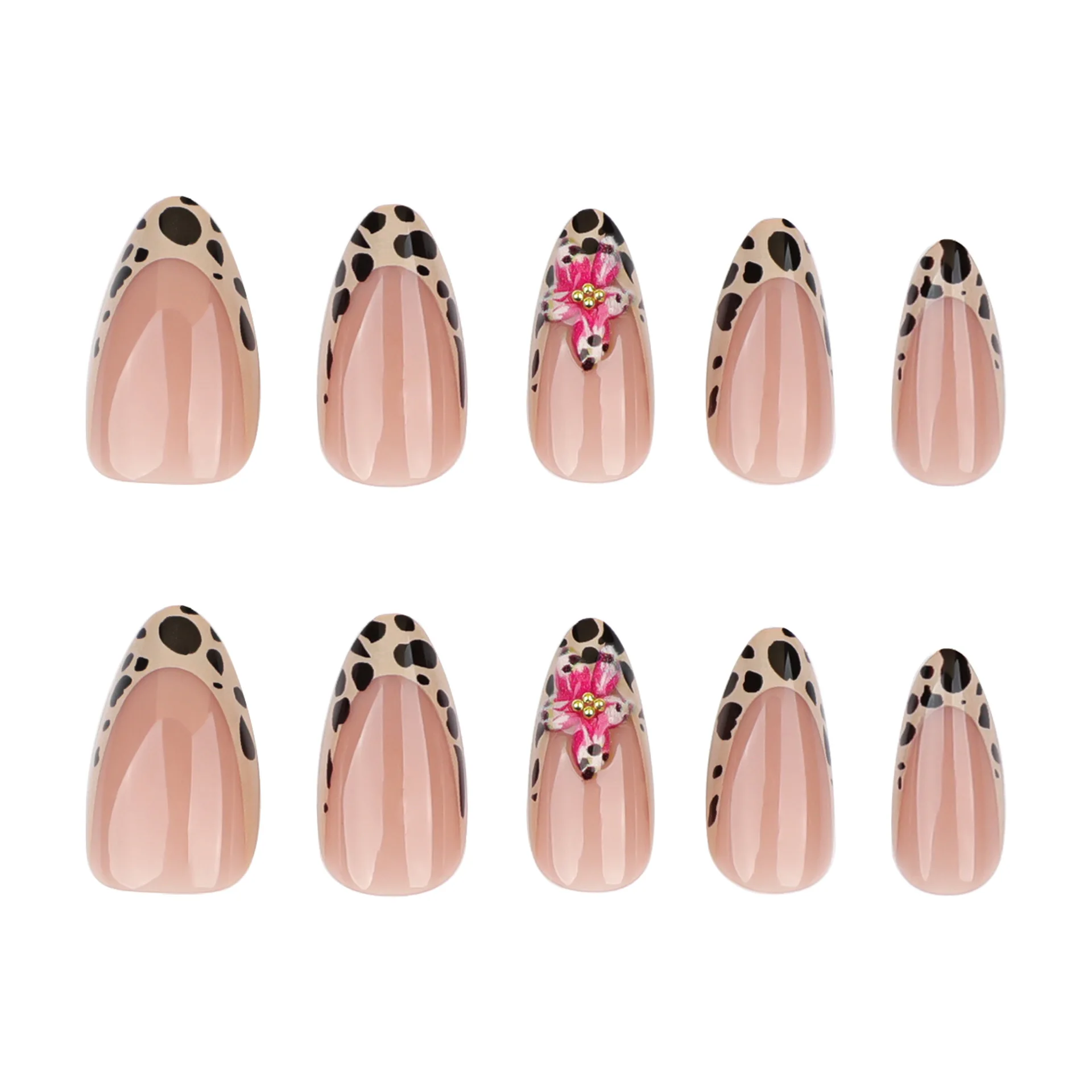 GETADME 24pcs Brown French Leopard Print Press On Nails Stereo Pink Flower Designs Autumn False Nails Sweet Cool Almond Fake Nail Tips