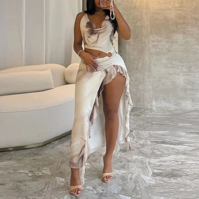 GETADME Aesthetic Tie Dye Printing Halter Lacing Hollow Out Split Ruffle Trim Backless Sexy Irregular Split Long Dresses Ladies Clubwear