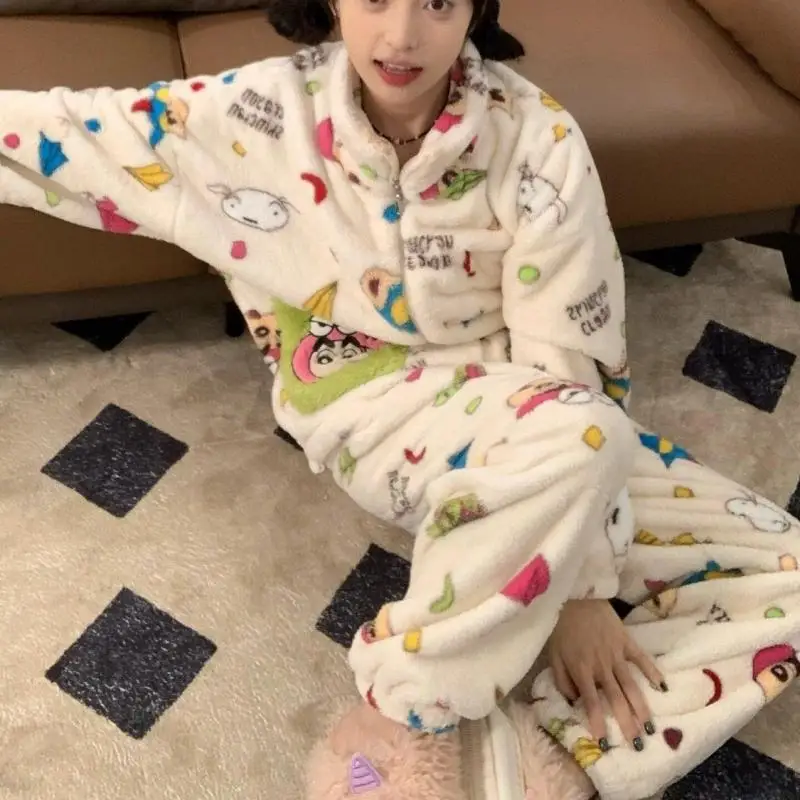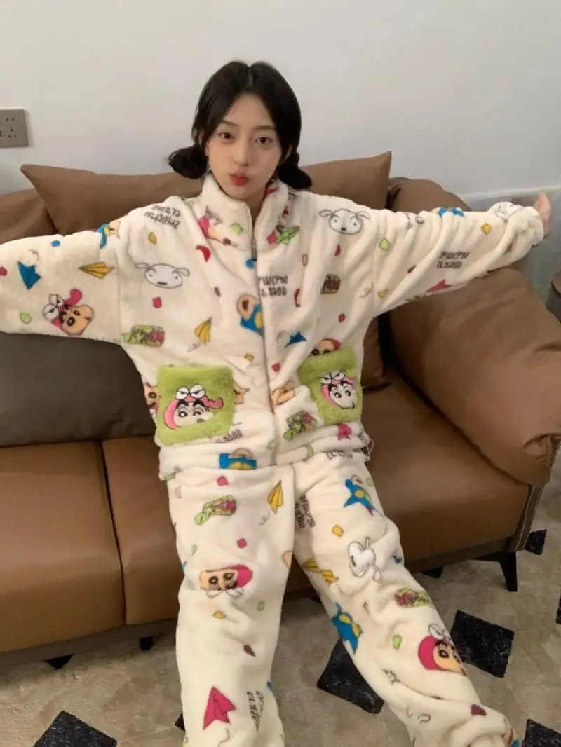 GETADME Anime Coral Velvet Pajamas Crayon Shinchans Kawaii Girl Long Sleeves Decorate Trousers Cartoon Loungewear Set Good Looks Gift