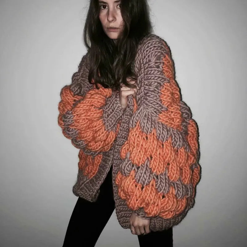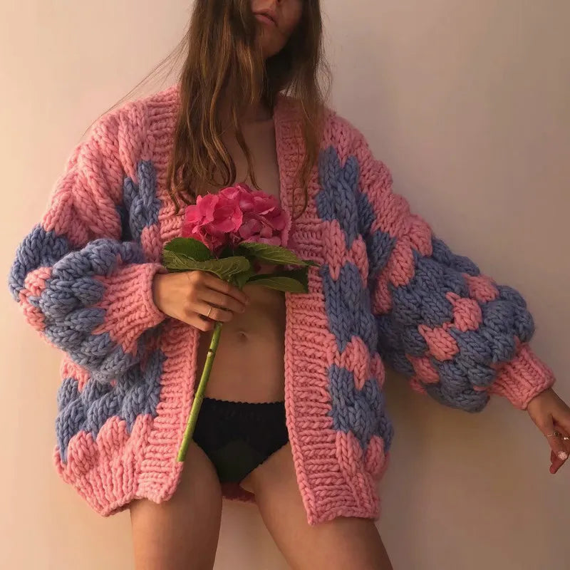 GETADME Autumn Winter Handmade Mohair Contrast Color Wave Striped Sweater Coat Knit Crocheted Cardigan Balls Hooked Lantern Sleeve Tops