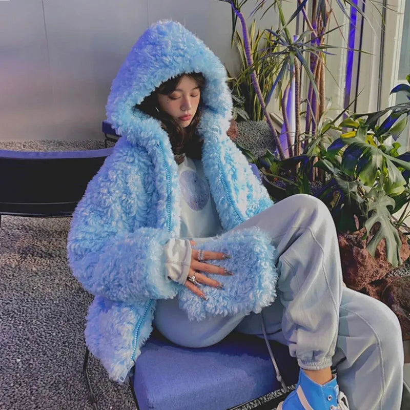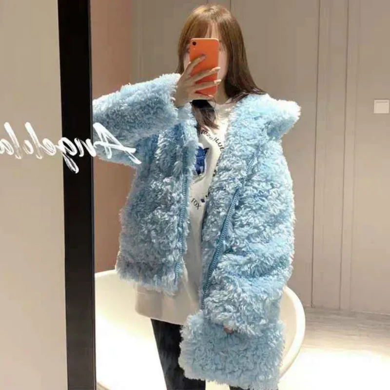 GETADME Autumn Winter Lambswool Hooded Fleece Jacket Women's Thick Zipper Plush Bomber Coat Cardigan Crop Teddy Flocking Parka Tops 2022