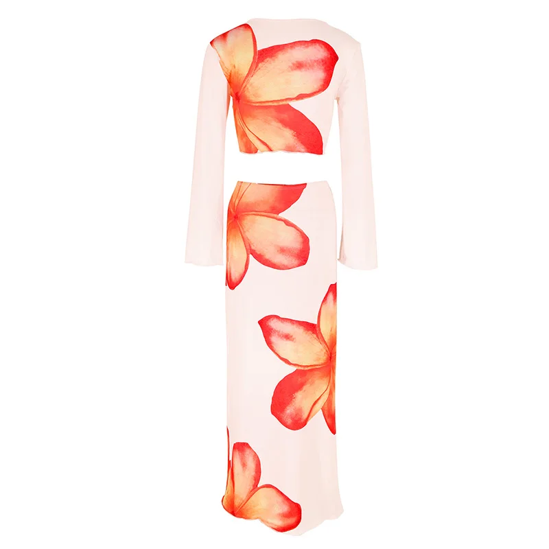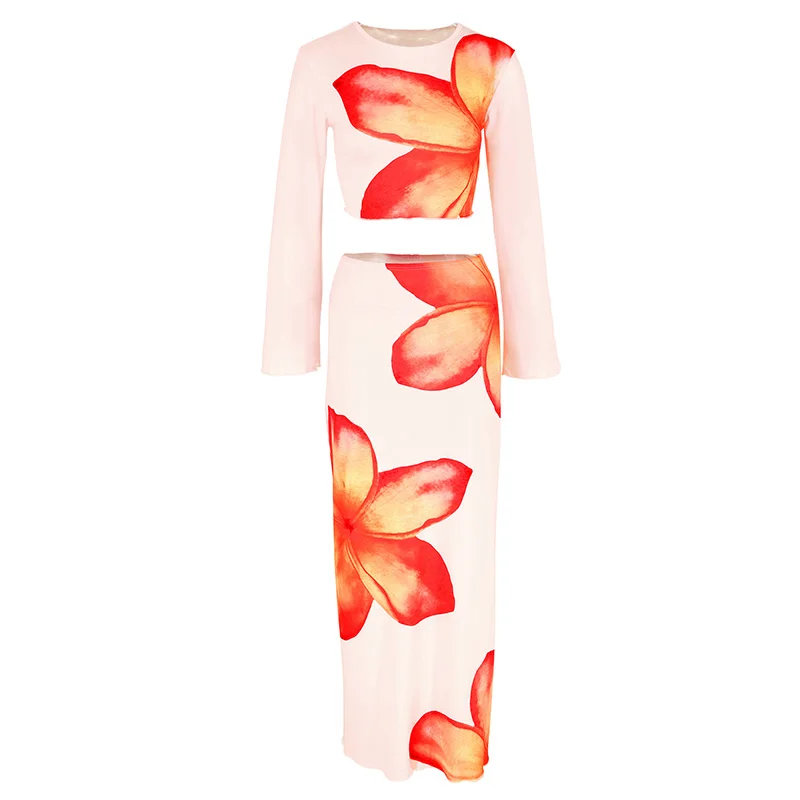 GETADME Autumn Winter Skirt T-shirt 2 Piece Women New Fashion Long Sleeves O-Neck Casual Slim Tees Sexy Red Print Skirt Lady Elegant Set