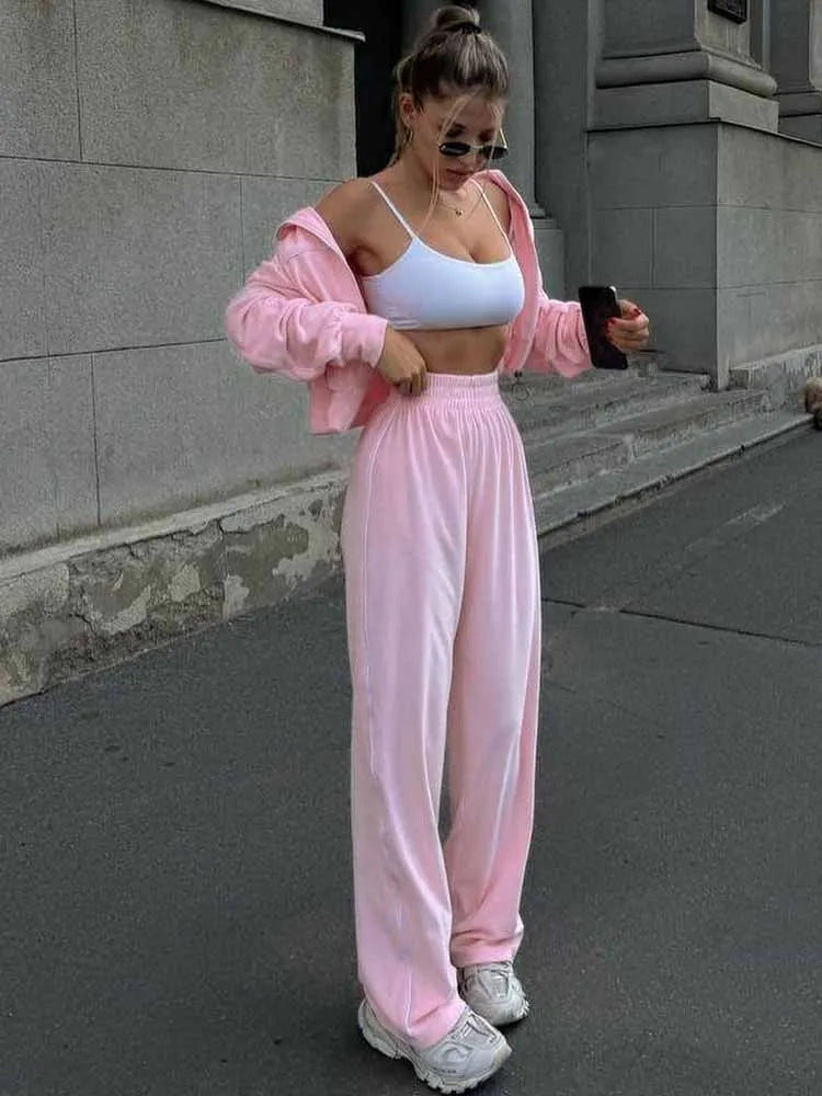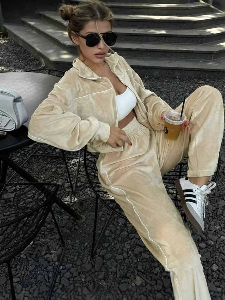 GETADME Women Sweatshirt Pants Suit Casual Stand Collar Zip-Up Jackets Loose Elastic Waist Pants Set Female 2025 Velvet Tracksuits