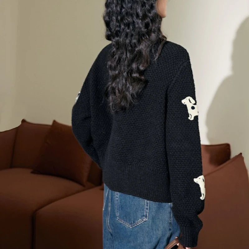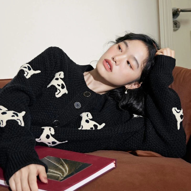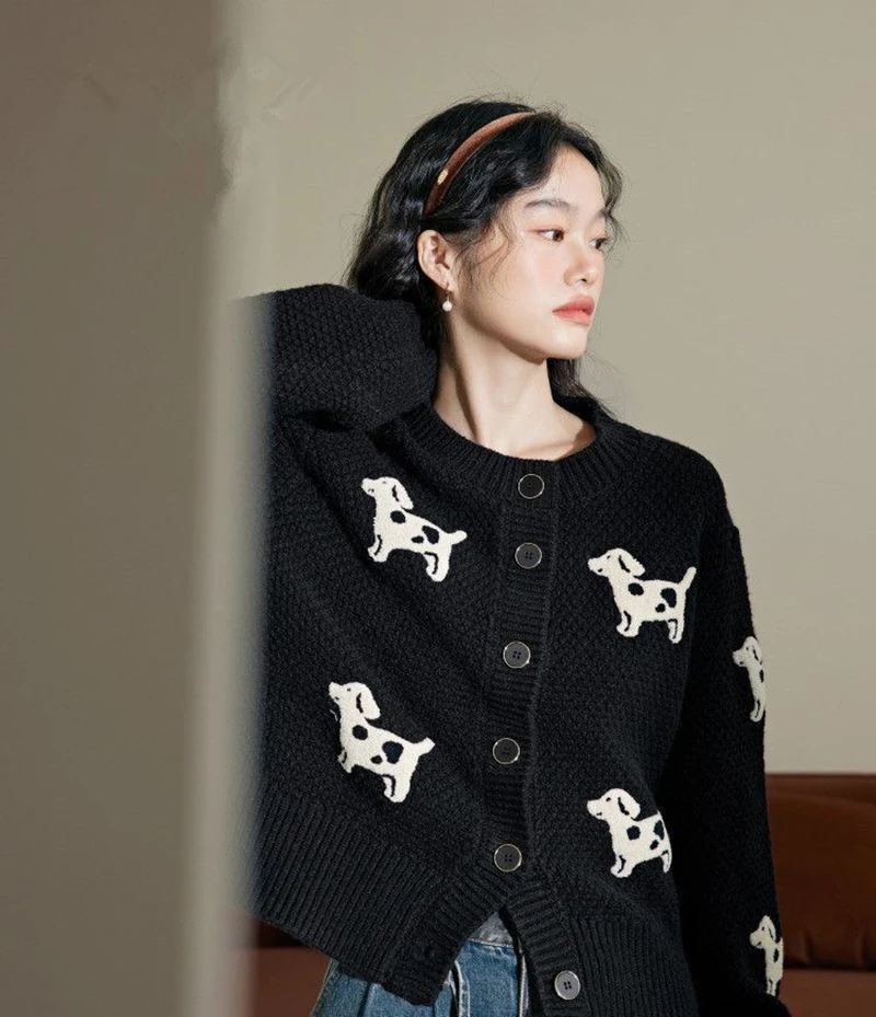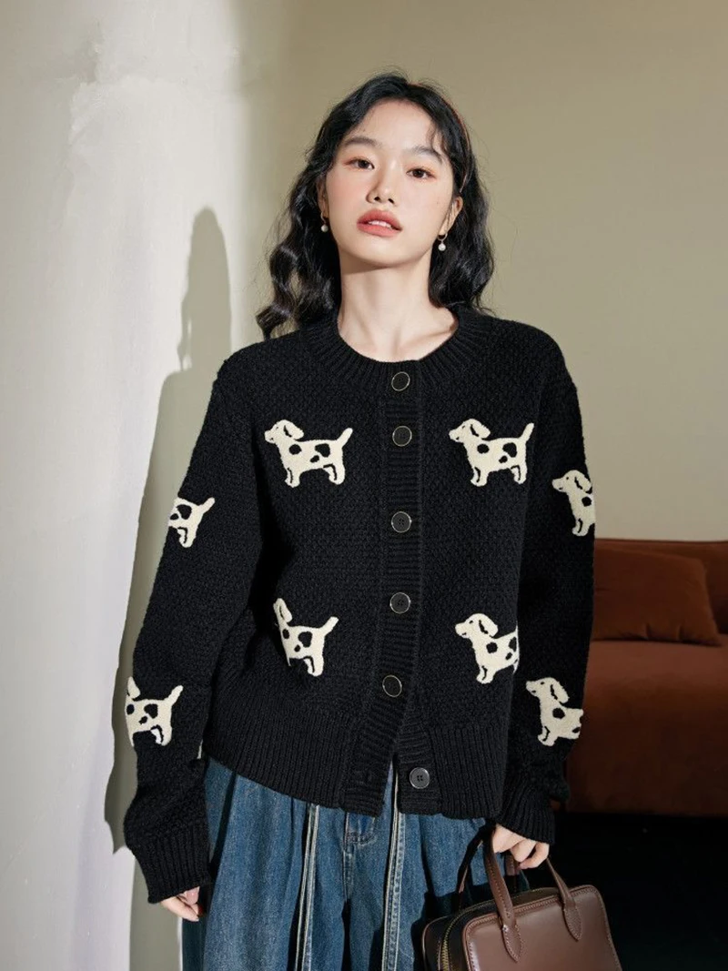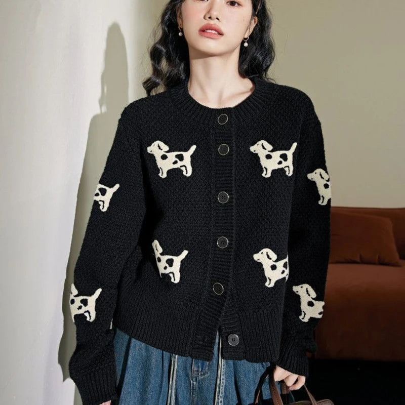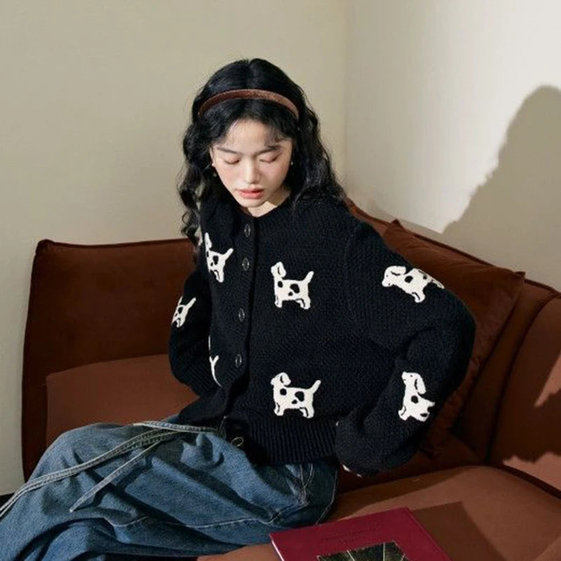 GETADME Black Knitted Cardigan Women Sing-Breasted Puppy O-Neck Loose Casual Sweater Fashion Lazy High Street Harajuku Y2K Tops