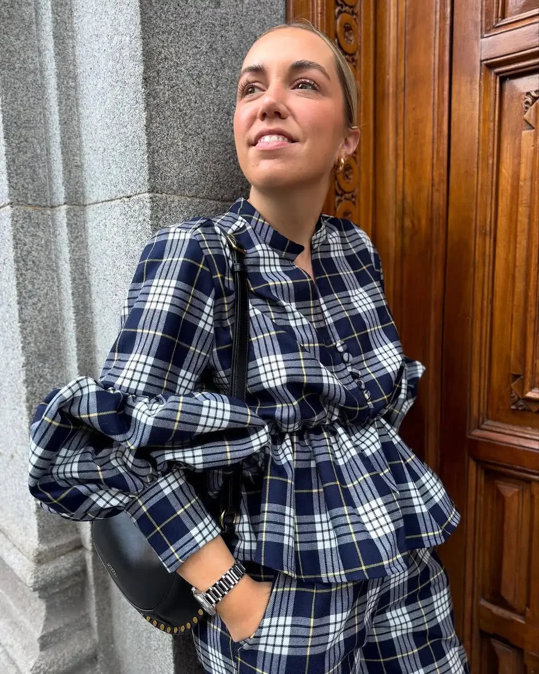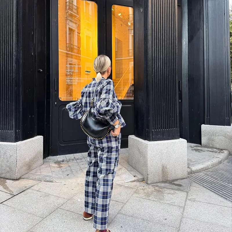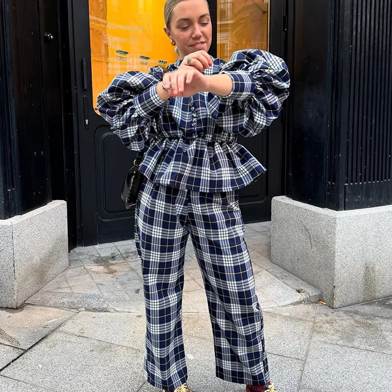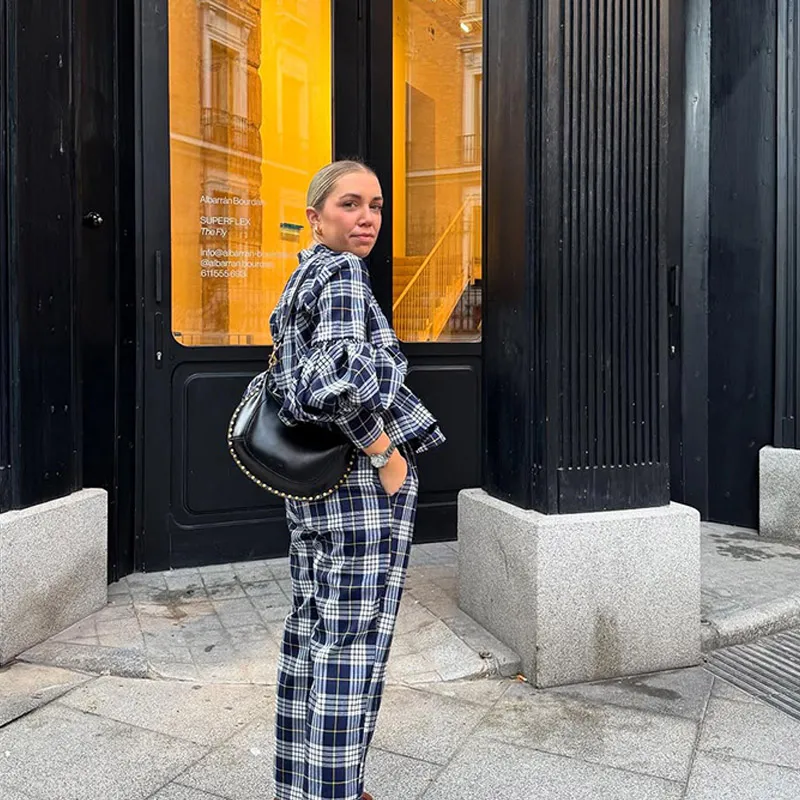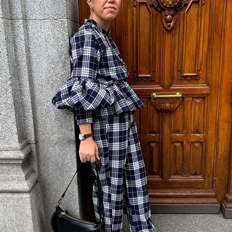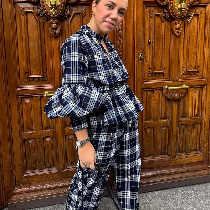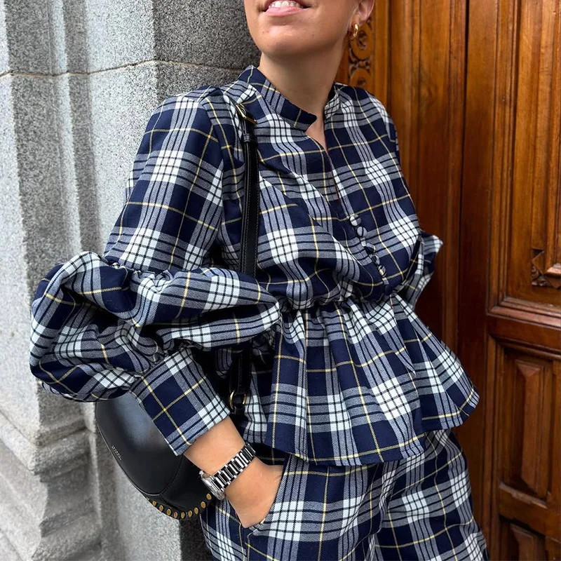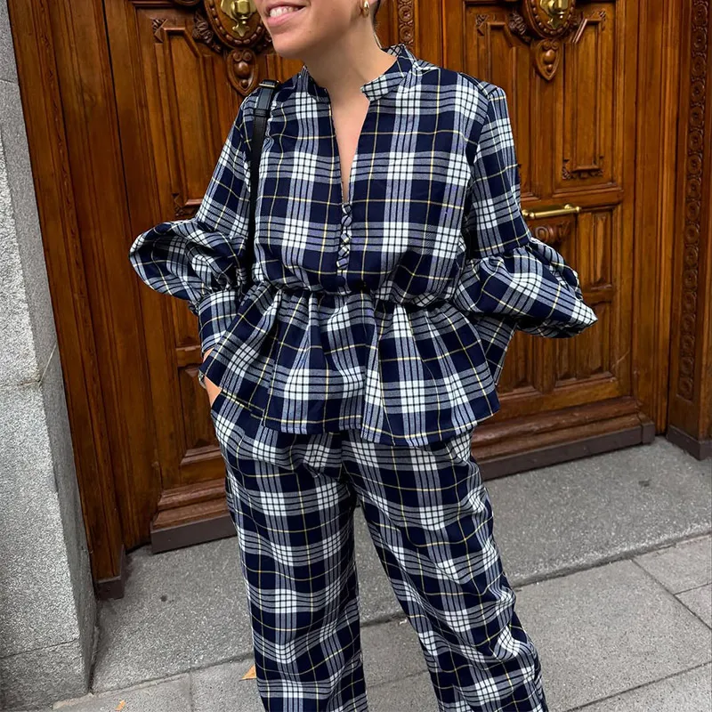 GETADME Classic Plaid Long Sleeves Woman Casual Pants Set Elegant V Neck Buttons Patchwork Trousers Suit 2025 Spring Lady Streetwear