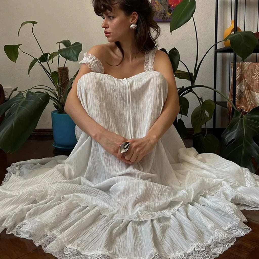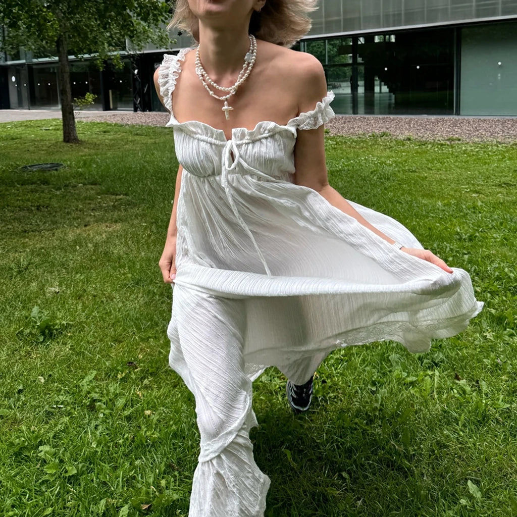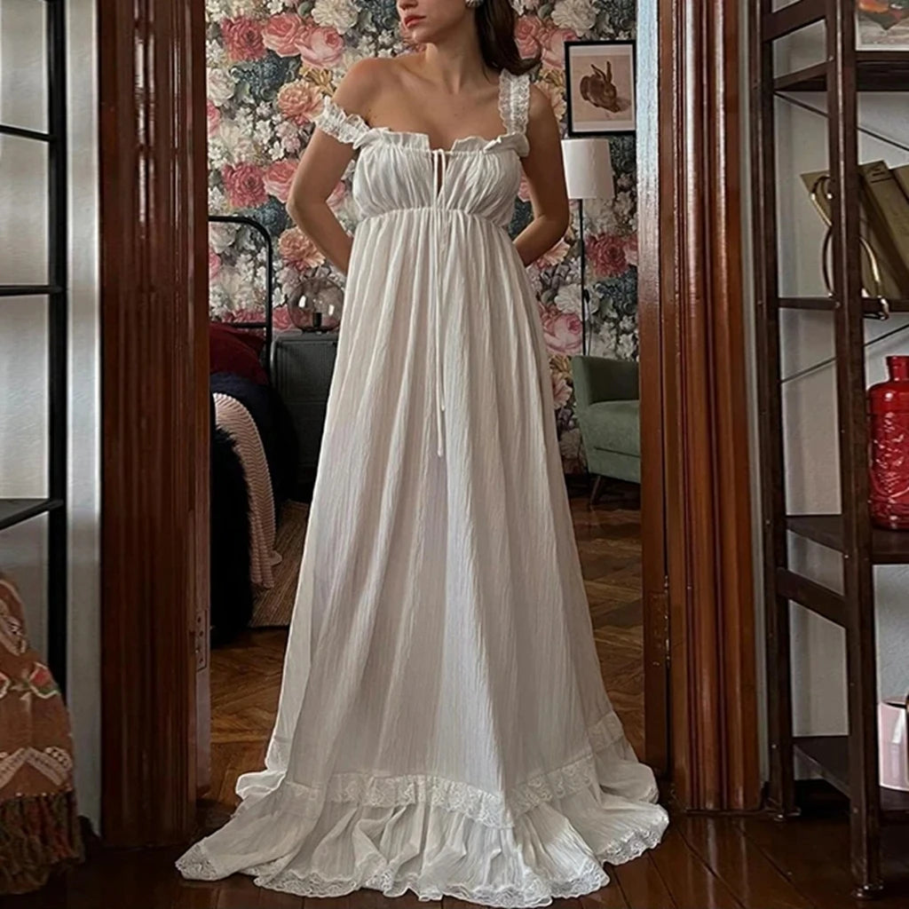 Women Long Tank Dress Lace Trim Tie-up V Neck Sleeveless Backless Empire Waist Ruffle Dress for Evening Party Club
