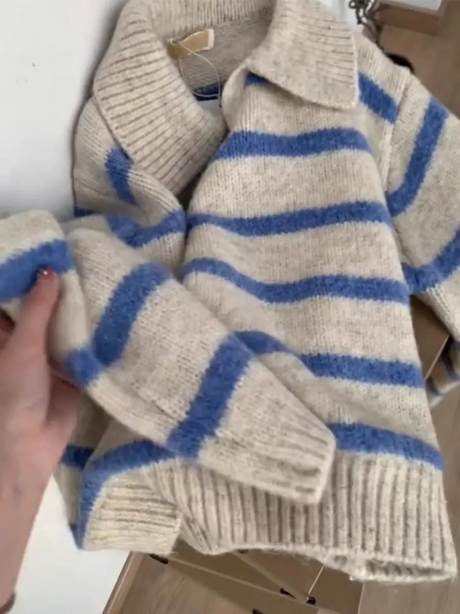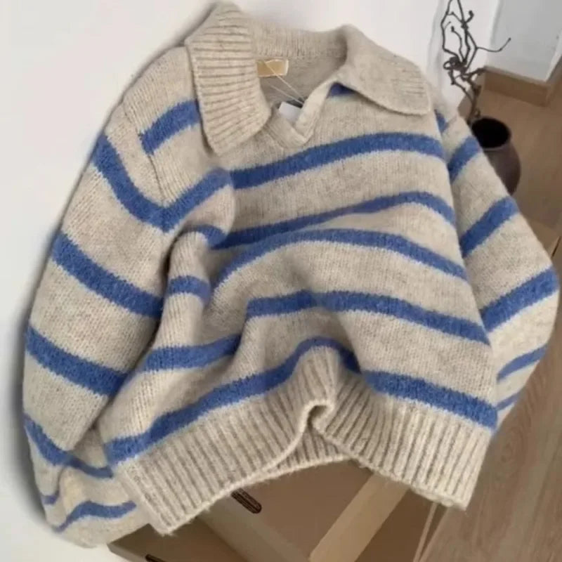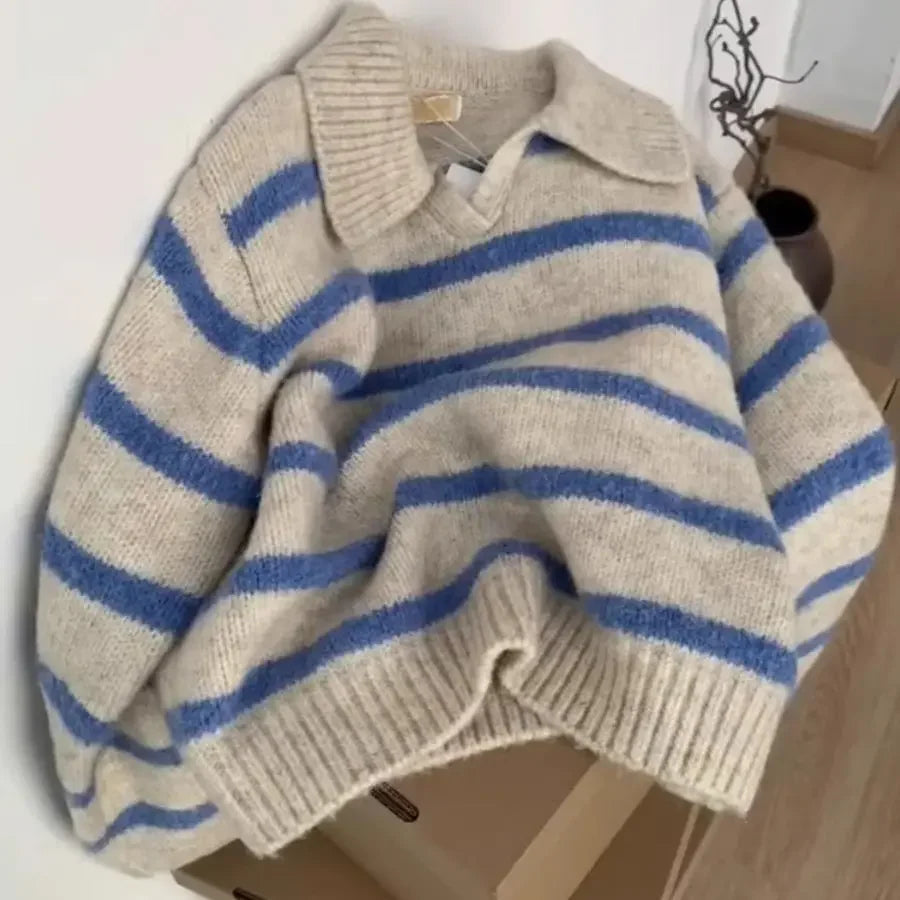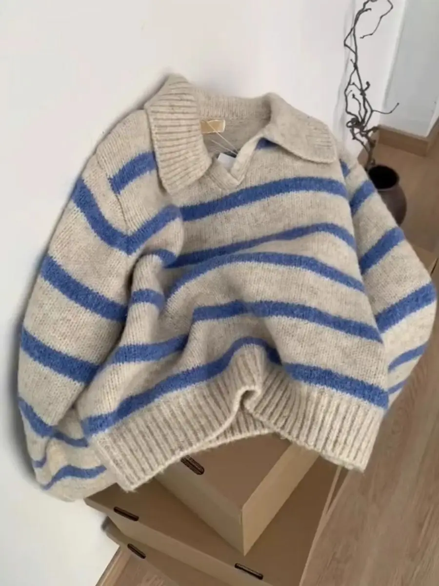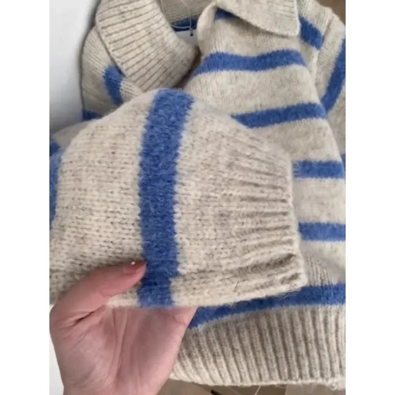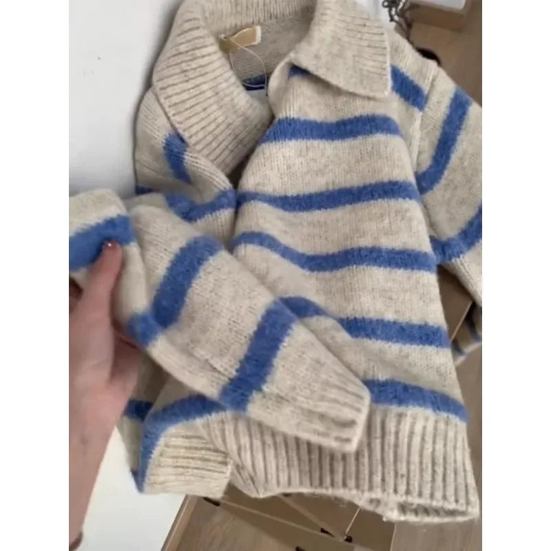 GETADME Deeptown Blue Striped Women Sweaters Vintage Long Sleeve Korean Fashion Knited Pullovers Loose Warm Jumper Autumn Winter Casual