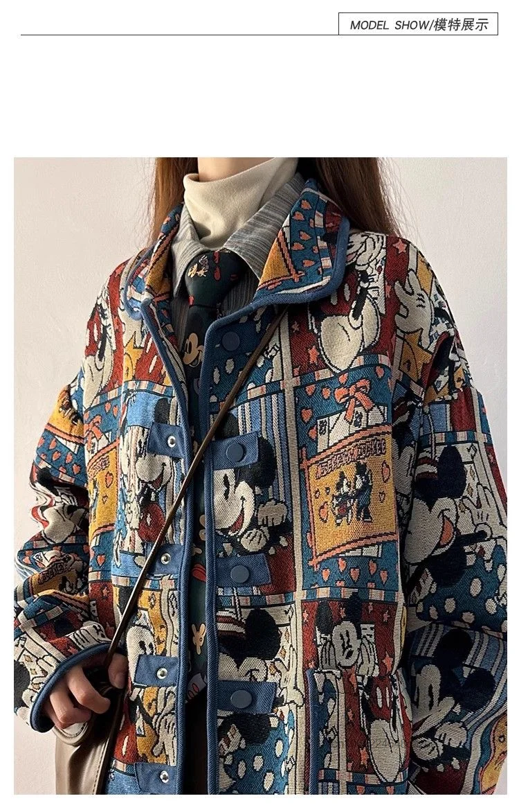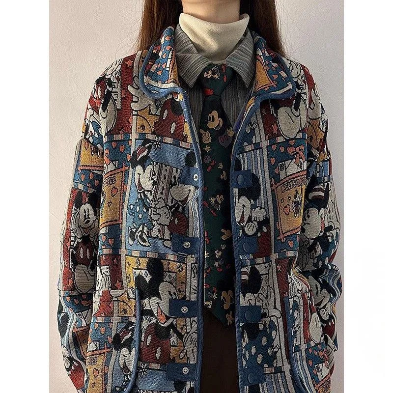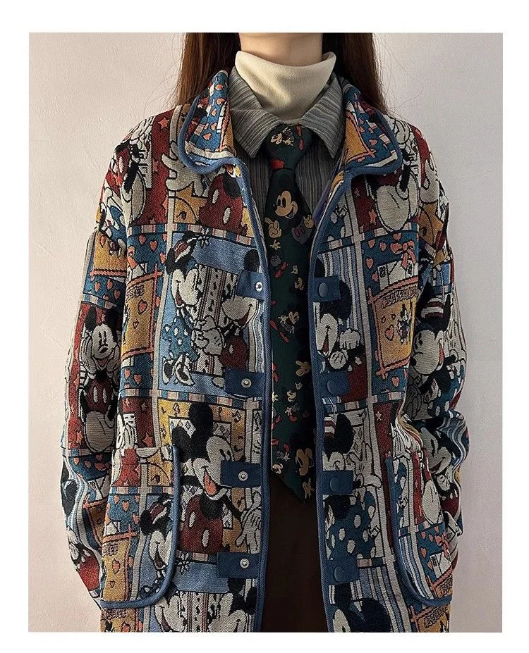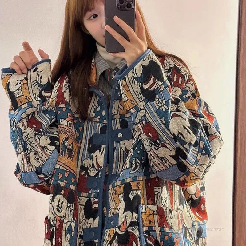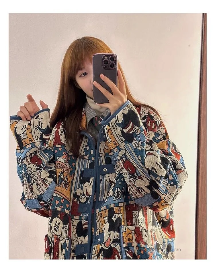 GETADME Disney Mickey Cute Cartoon Jacquard Jacket Women Autumn American Style Vintage Loose Coat Unique Design Trendy Versatile Jacket