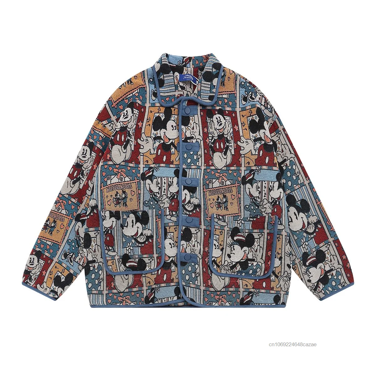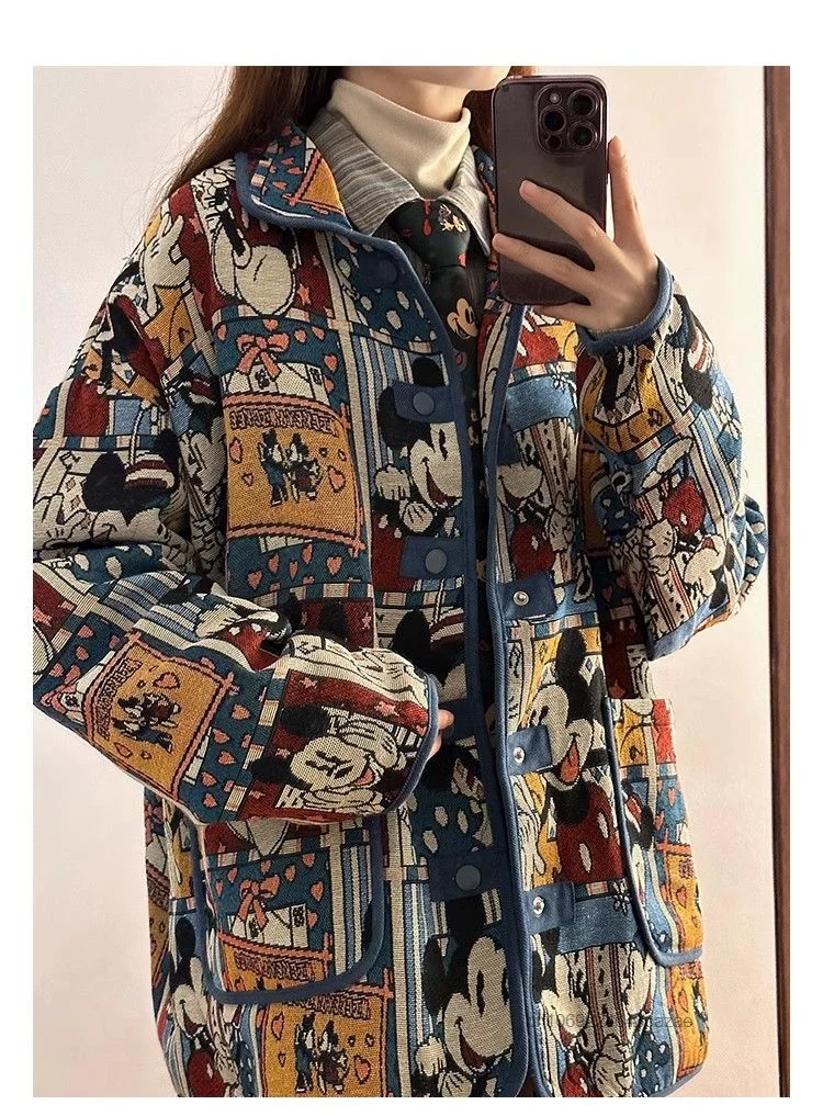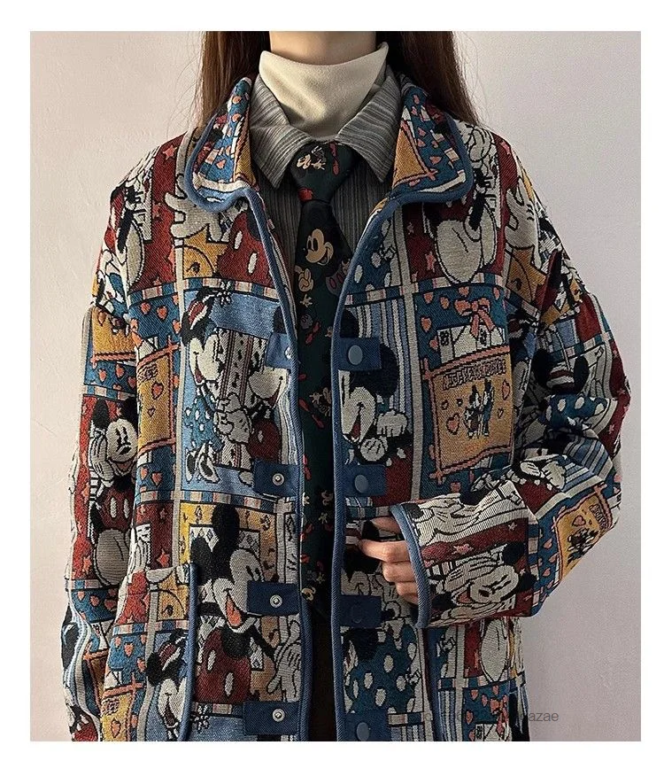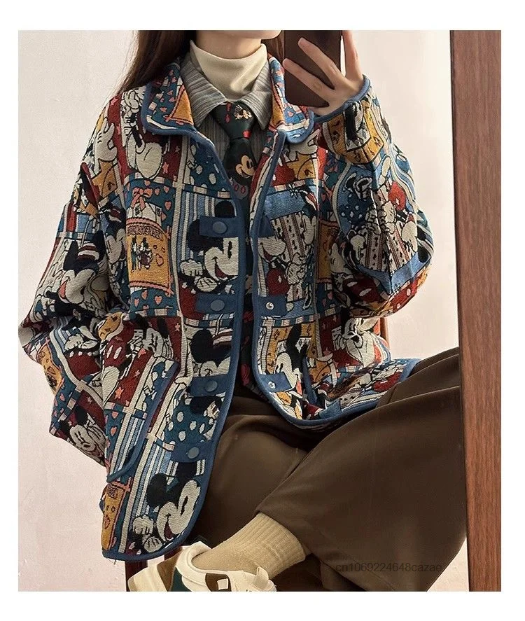 GETADME Disney Mickey Cute Cartoon Jacquard Jacket Women Autumn American Style Vintage Loose Coat Unique Design Trendy Versatile Jacket